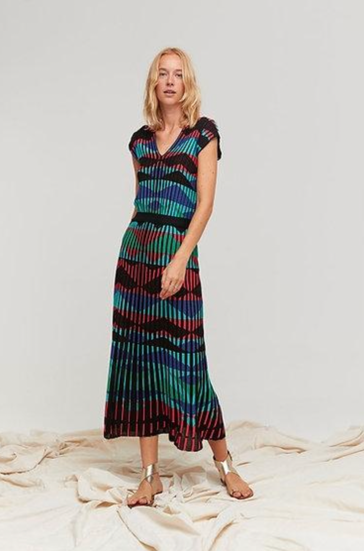 Graceful Aldo Martins Skirt that flares out. The vertical pattern flatters nicely. The Aldo Martins Skirt has an elastic band and is made of cotton and bamboo.