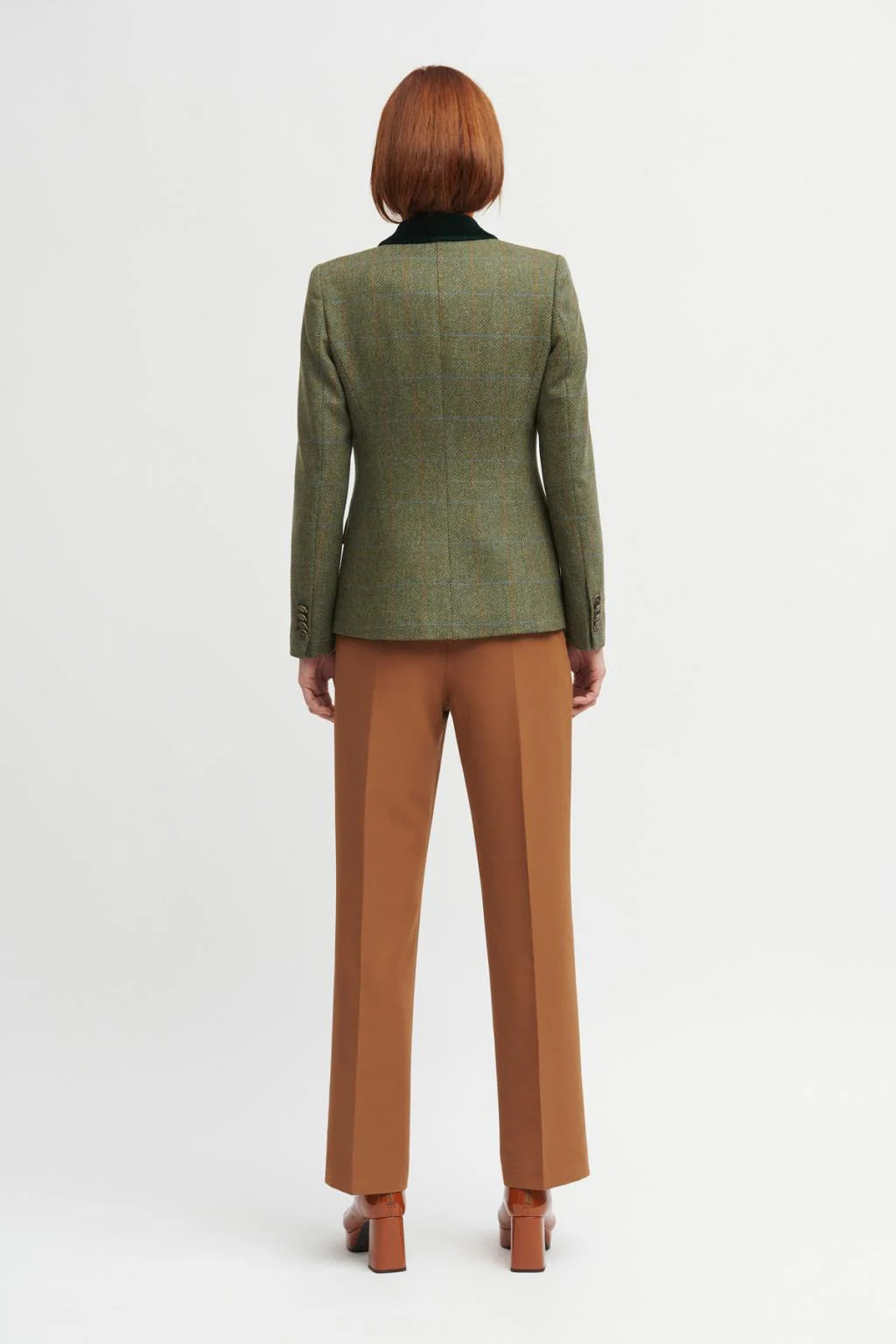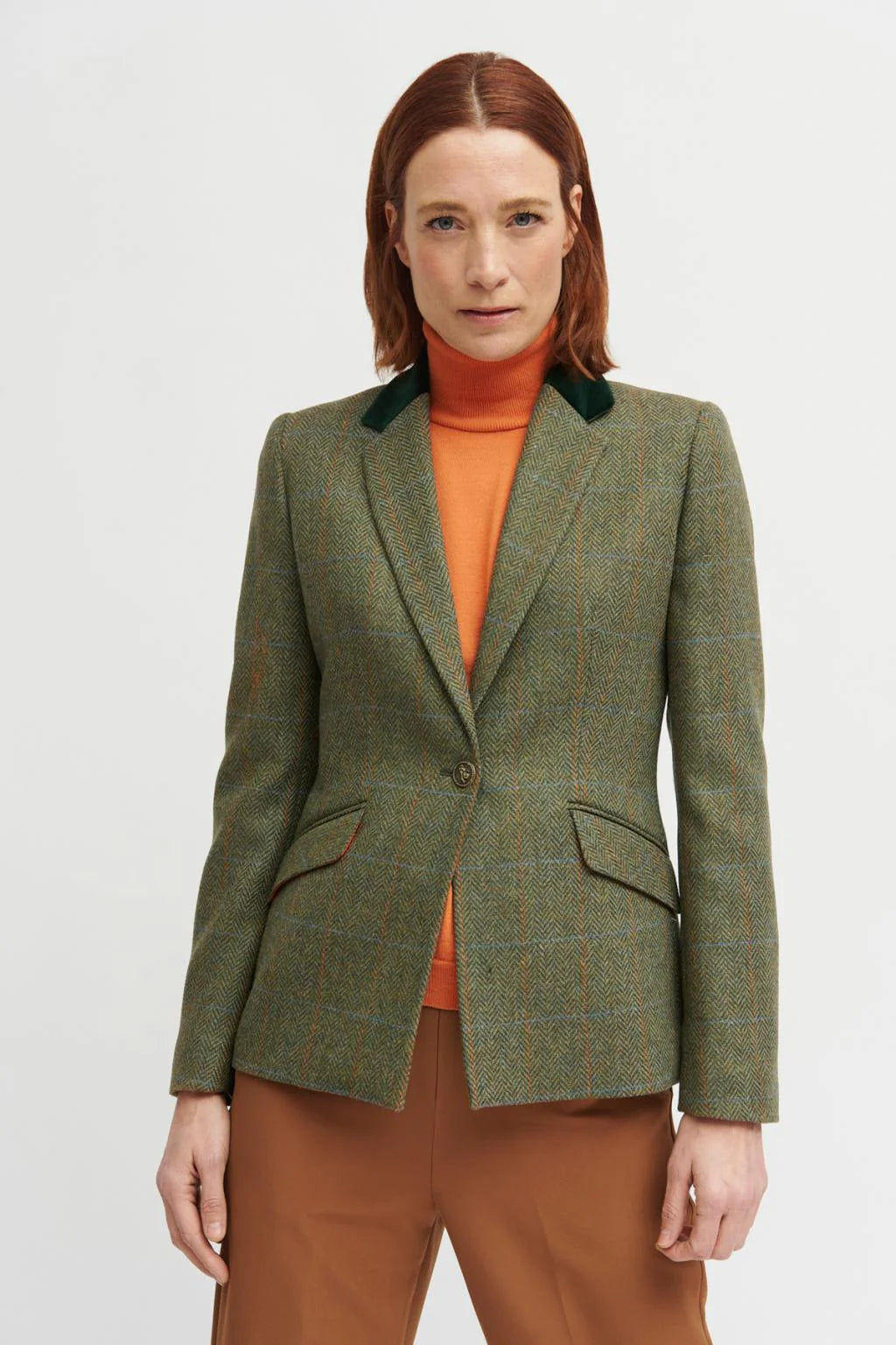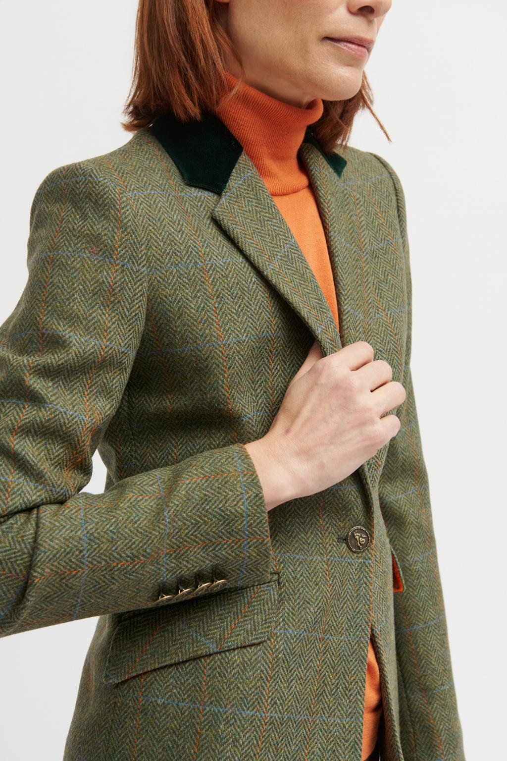 The Almeria blazer is a fitted jacket with houndstooth pattern. Notched lapel collar and velvet detail. Front closure with an embossed metal button. Long sleeves with false button closure and slight opening. False flap pockets. Straight hem without openings. Contrast interior lining.