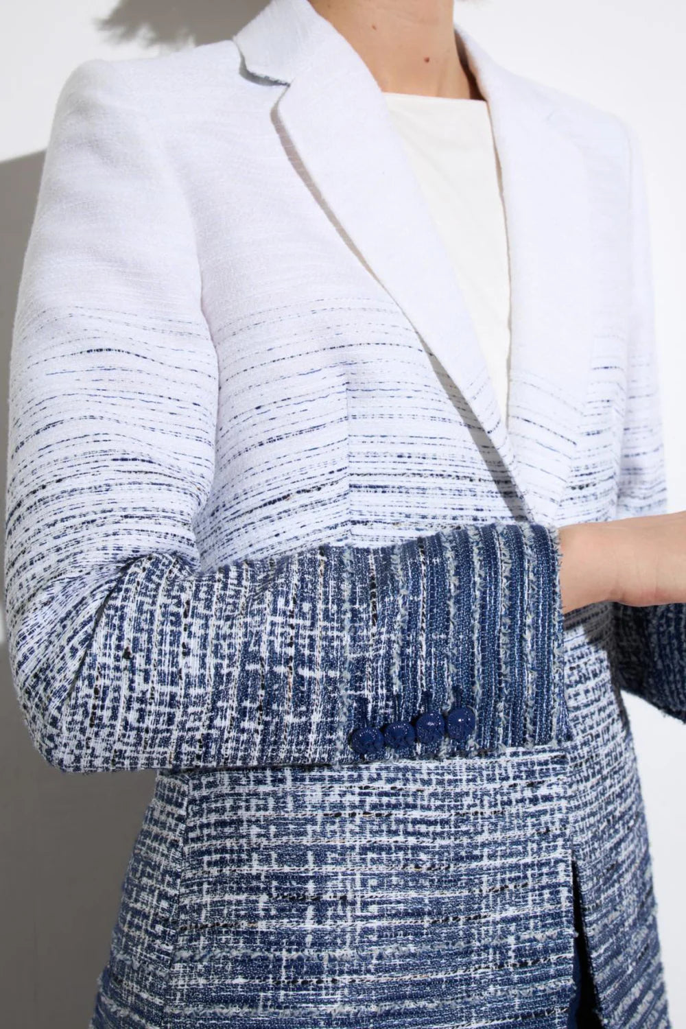 Tailored blazer in gradient tweed. Notched lapel collar. Jeweled button front closure. Long sleeves with matching buttons. Two concealed welt front pockets. Rounded hem.