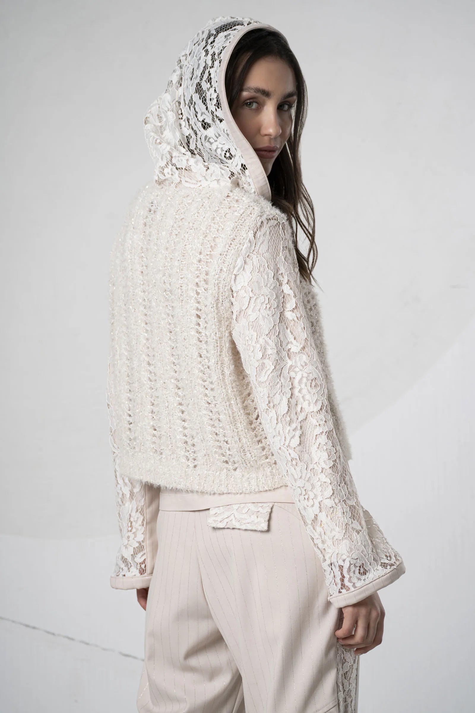 Powder pink jacket made of fur-effect perforated knit with micro sequins. Powder pink lace sleeves and hood. Trim in pinstripe fabric with silver micro lurex. Soft jacket for romantic and chic looks.