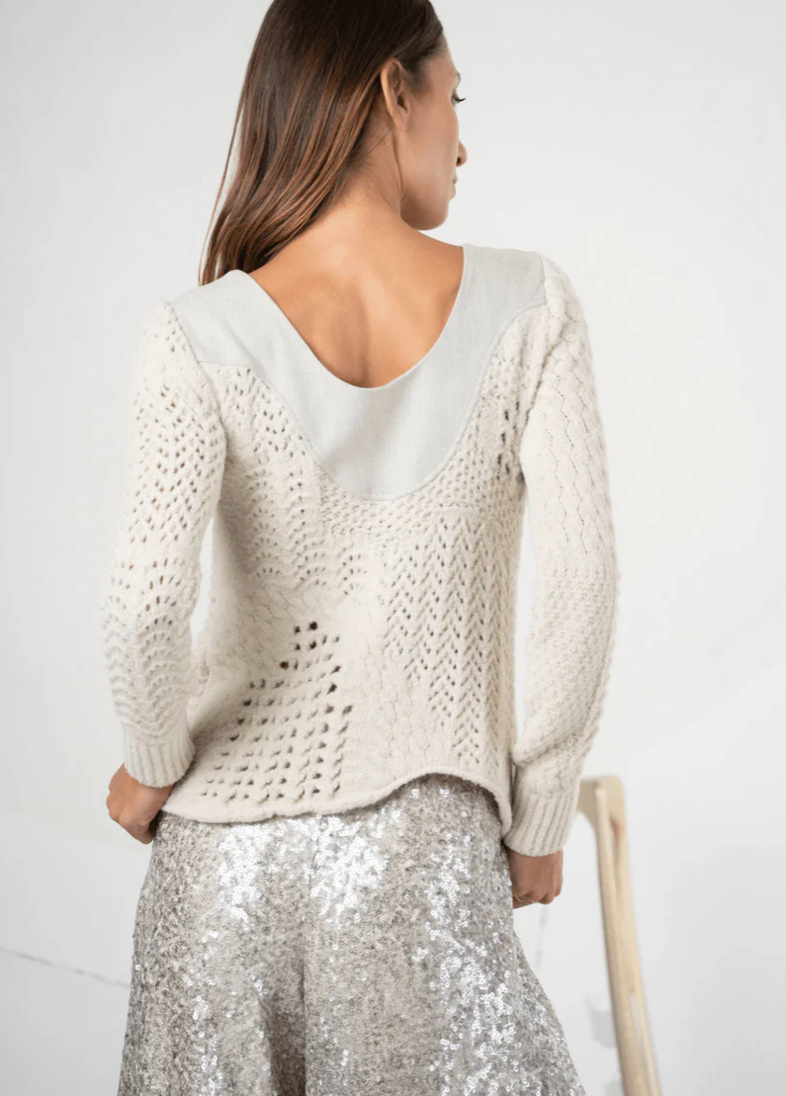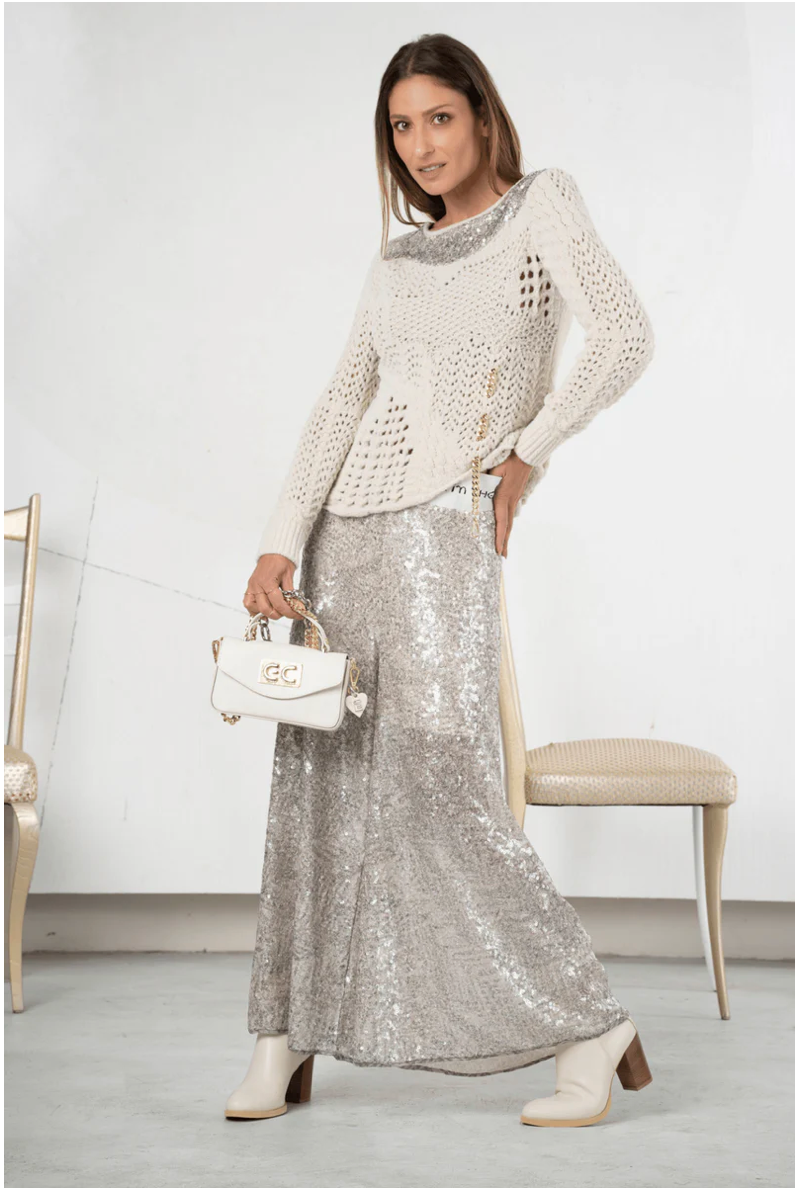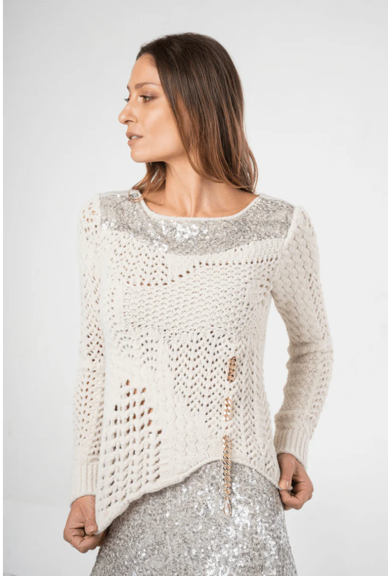 The Elisa Cavaletti open-knit jumper is beautifully textured with a patchwork of cable, crochet and ladder stitches that show just enough skin – perfect for layering over a cami or sparkly top. The sequin panel across the neckline adds subtle shimmer, while the asymmetric hem and signature gold chain detail bring that unmistakable Cavaletti touch.