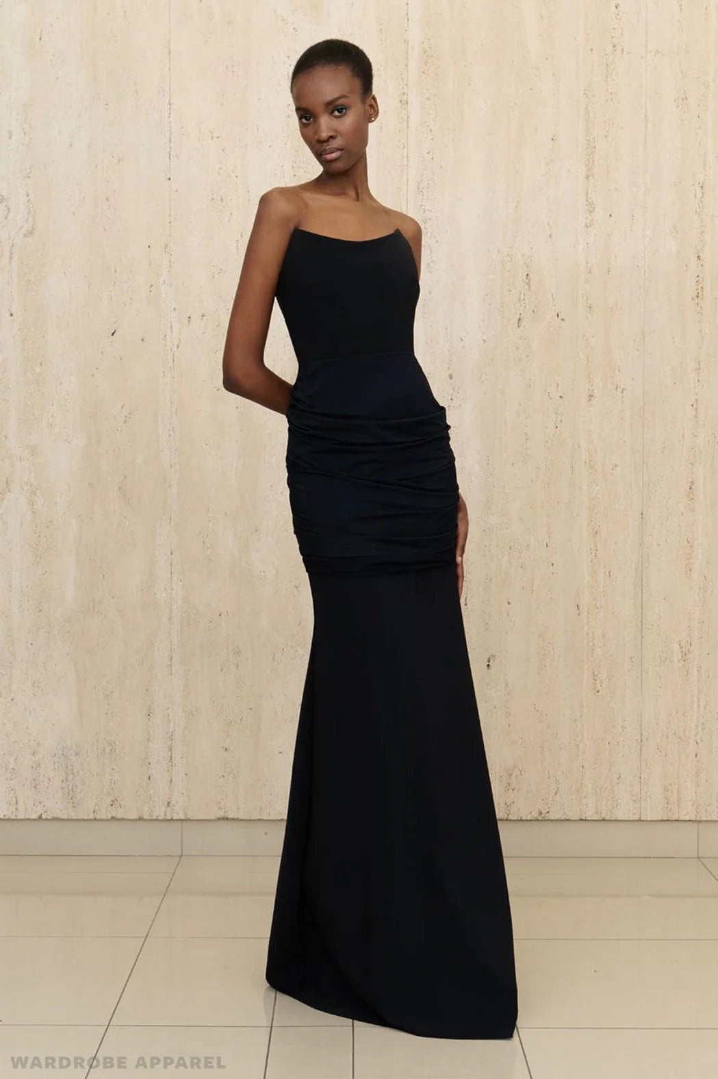 The Uheri Gown by Greta Constantine exudes timeless sophistication. This strapless gown features expertly crafted ruched panels that accentuate the waist and hips, creating a flattering silhouette. A flowing train adds an elegant touch, making it a perfect choice for formal occasions where understated glamour is key.