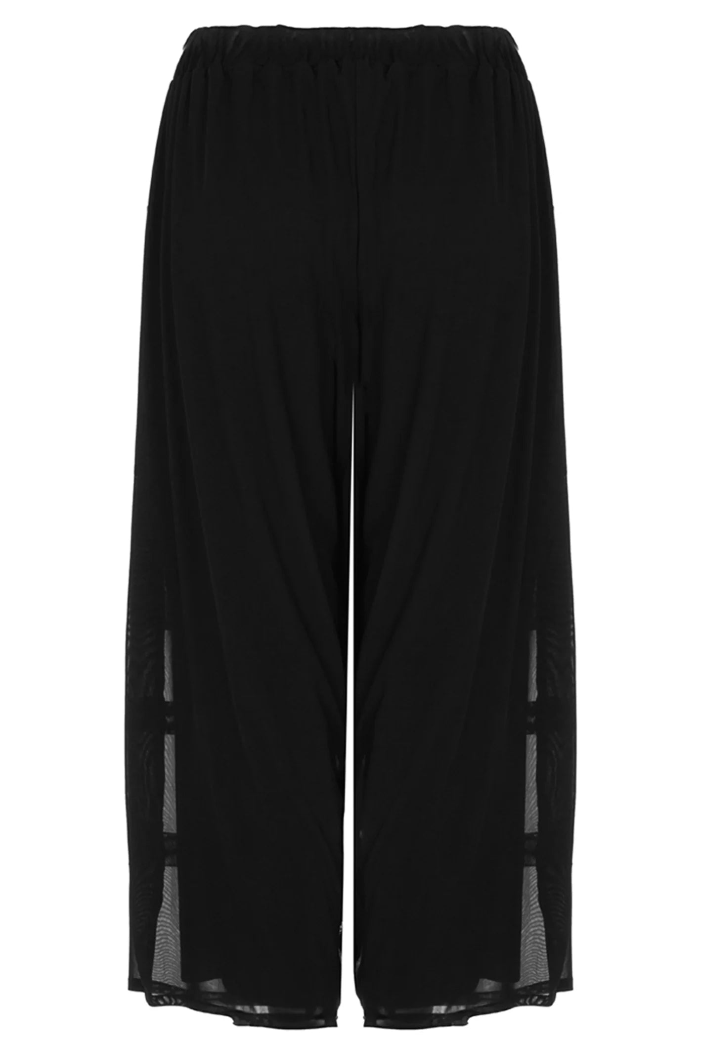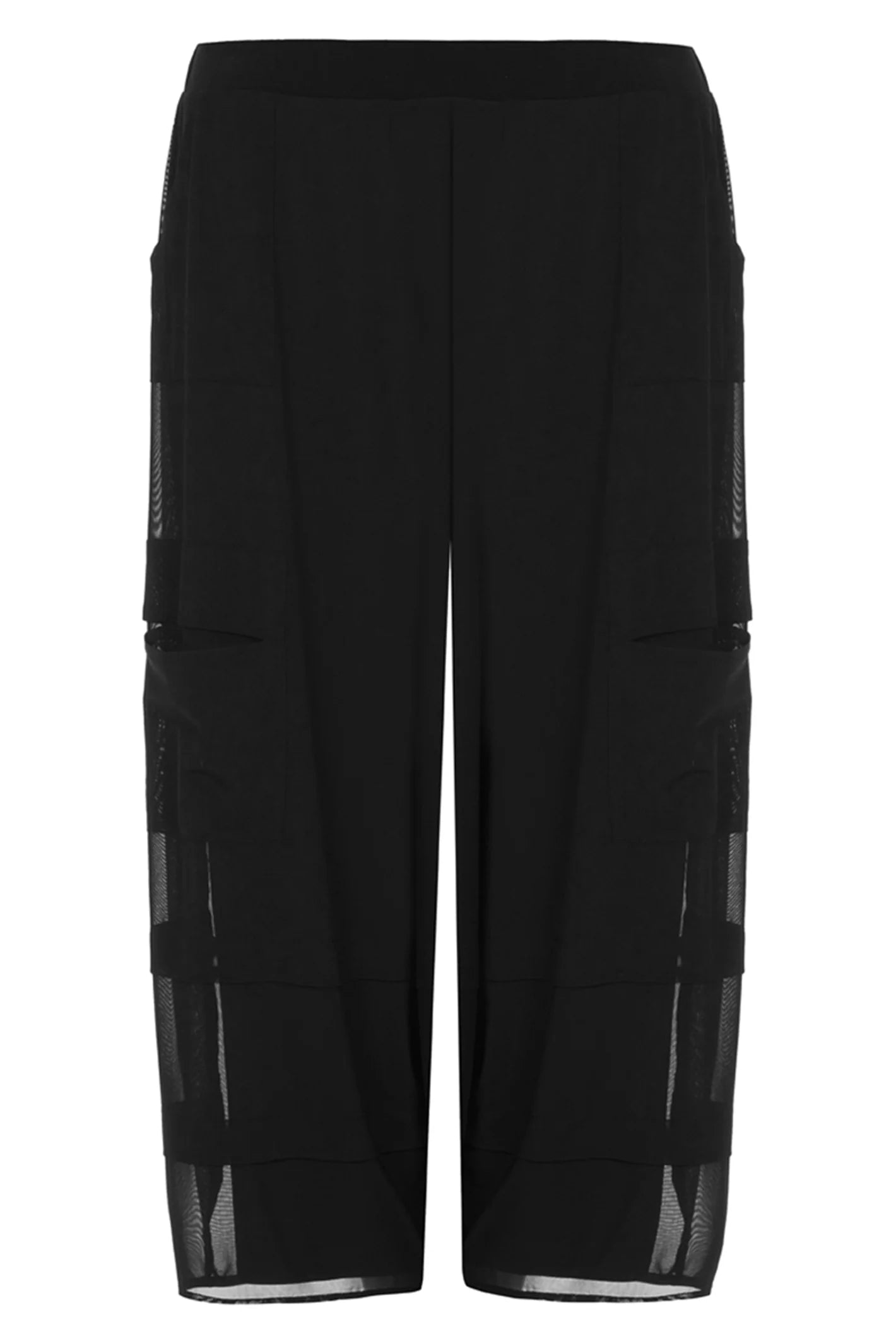 Kozan Mello cropped trousers in Black Mesh Overlay. These chic trousers offer a unique layered design, combining comfort and style for a versatile look.