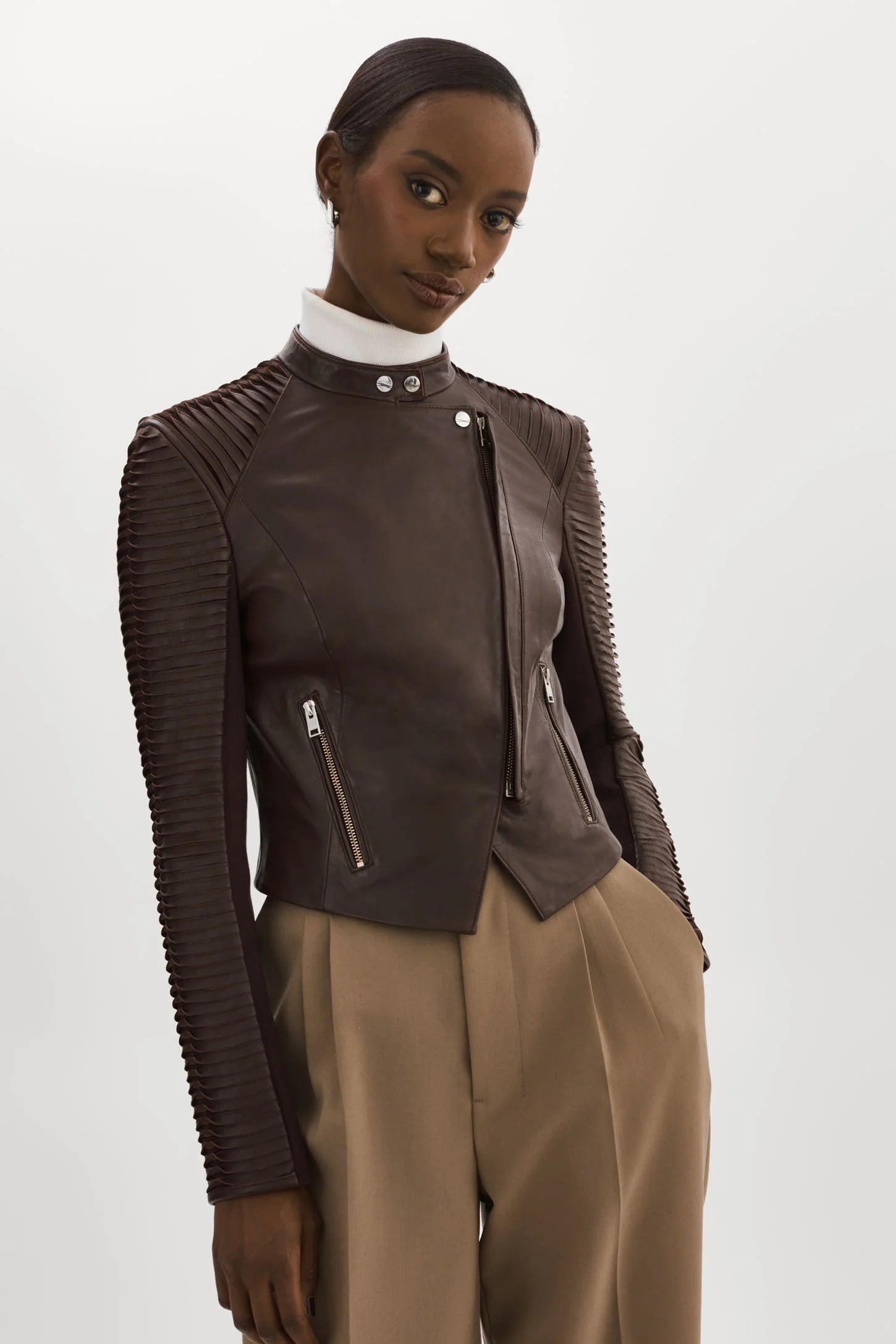 With its stunning textured sleeves, high neckline, and flawless fit, the Azra knows how to hold a gaze. At once subtle and eye-catching, this premium leather jacket refreshes the classic moto jacket in favor of a contemporary top-piece that brings any look to new, fashion-forward heights.