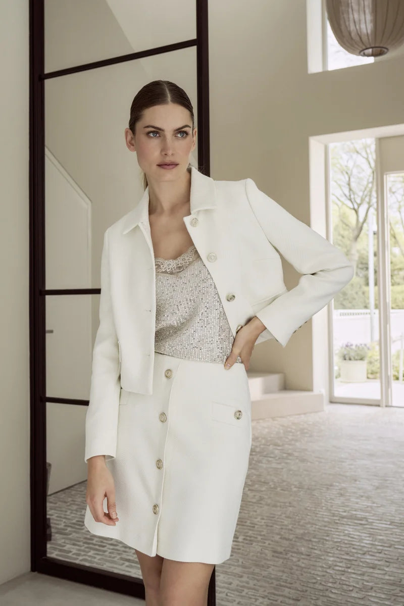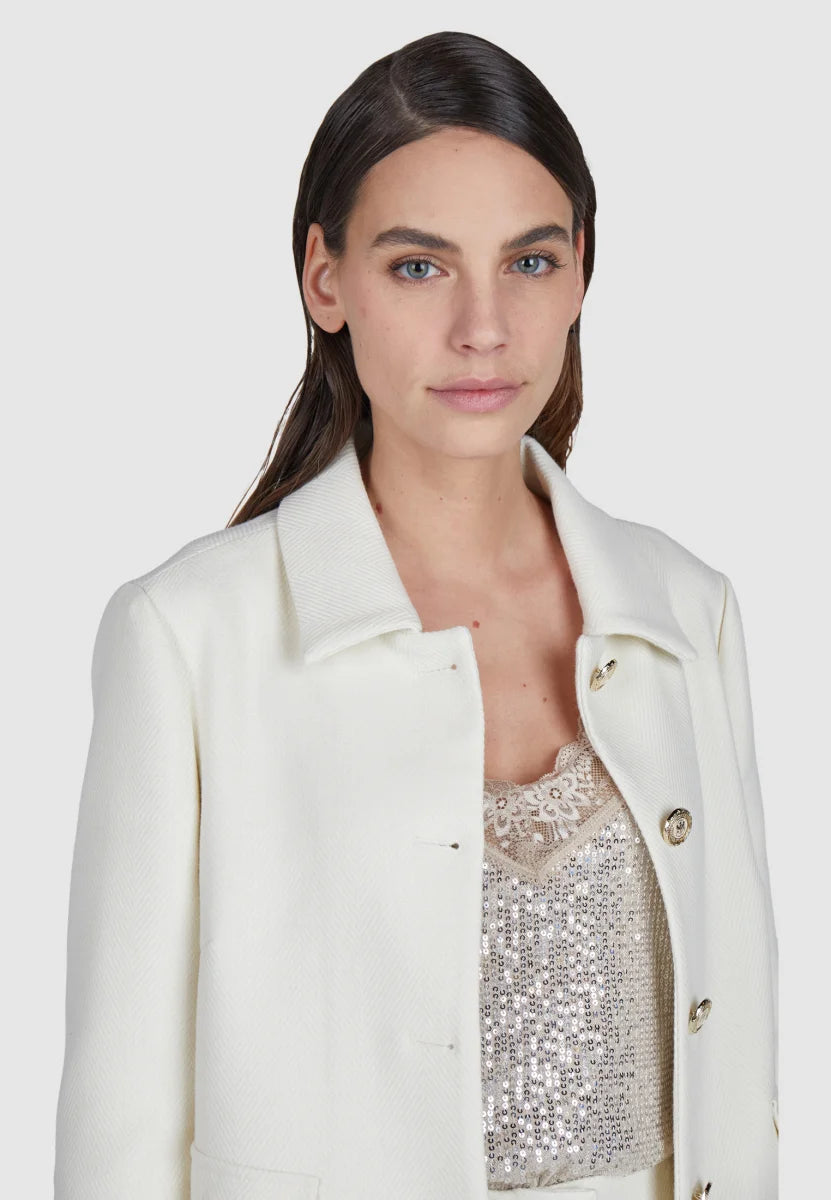 Discover the jacket with herringbone structure, crafted from a viscose blend with stretch. This jacket combines classic elegance with a touch of modernity. Perfect for a stylish appearance in any situation.