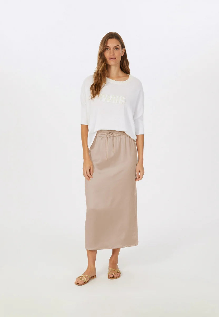 This sweater features artistic PARIS bead embroidery that adds a luxurious touch to the design. The soft cotton yarn ensures a high level of comfort, while the casual oversized fit and side slits create a modern silhouette.