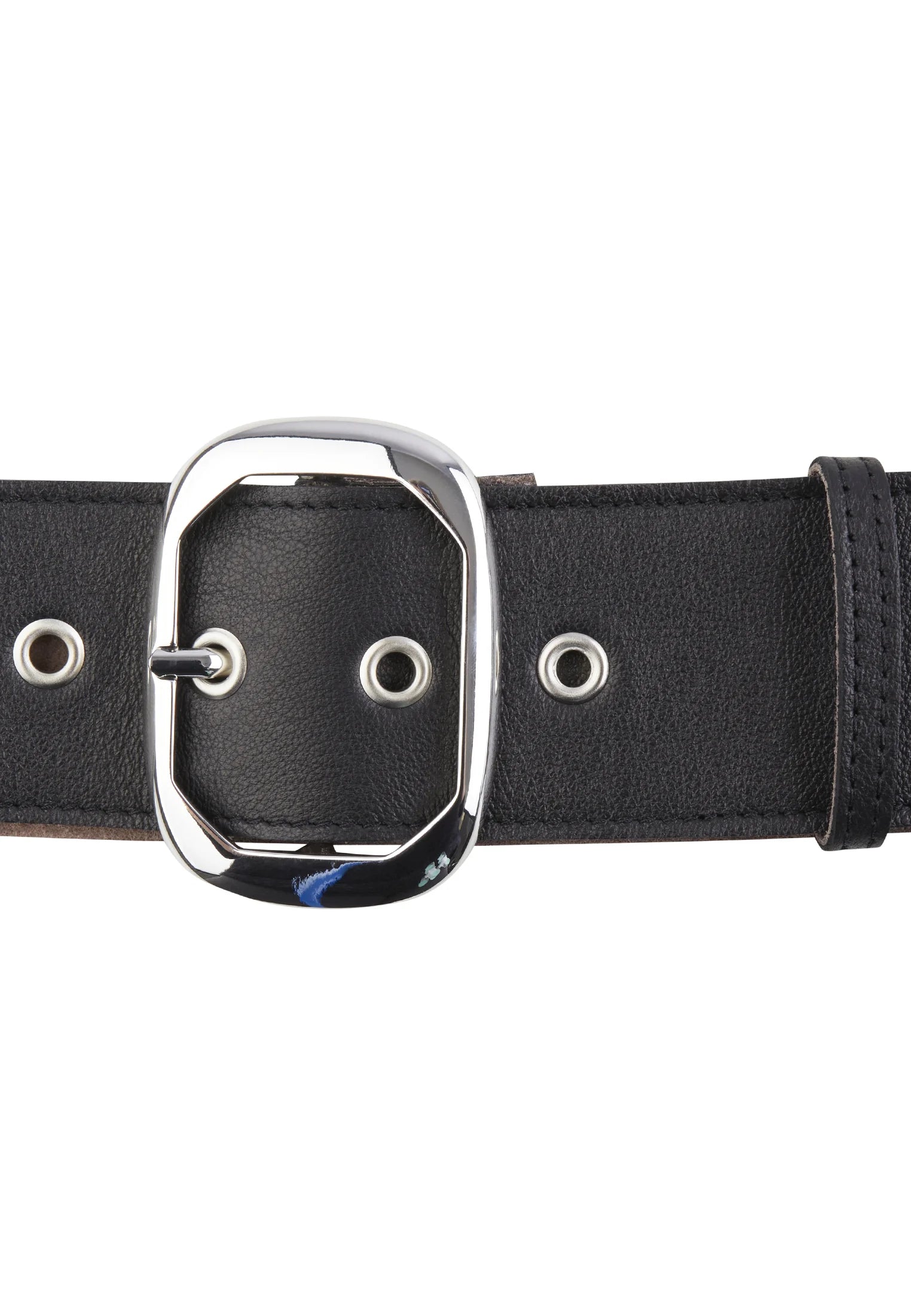 This belt with a wide oval buckle in a high format is an absolute must-have. With a width of 60 mm, it adds a sophisticated touch to any look. The pin buckle allows for an individual fit and thus provides a secure hold. The silver-coloured eyelets in the belt holes add a particularly modern accent.