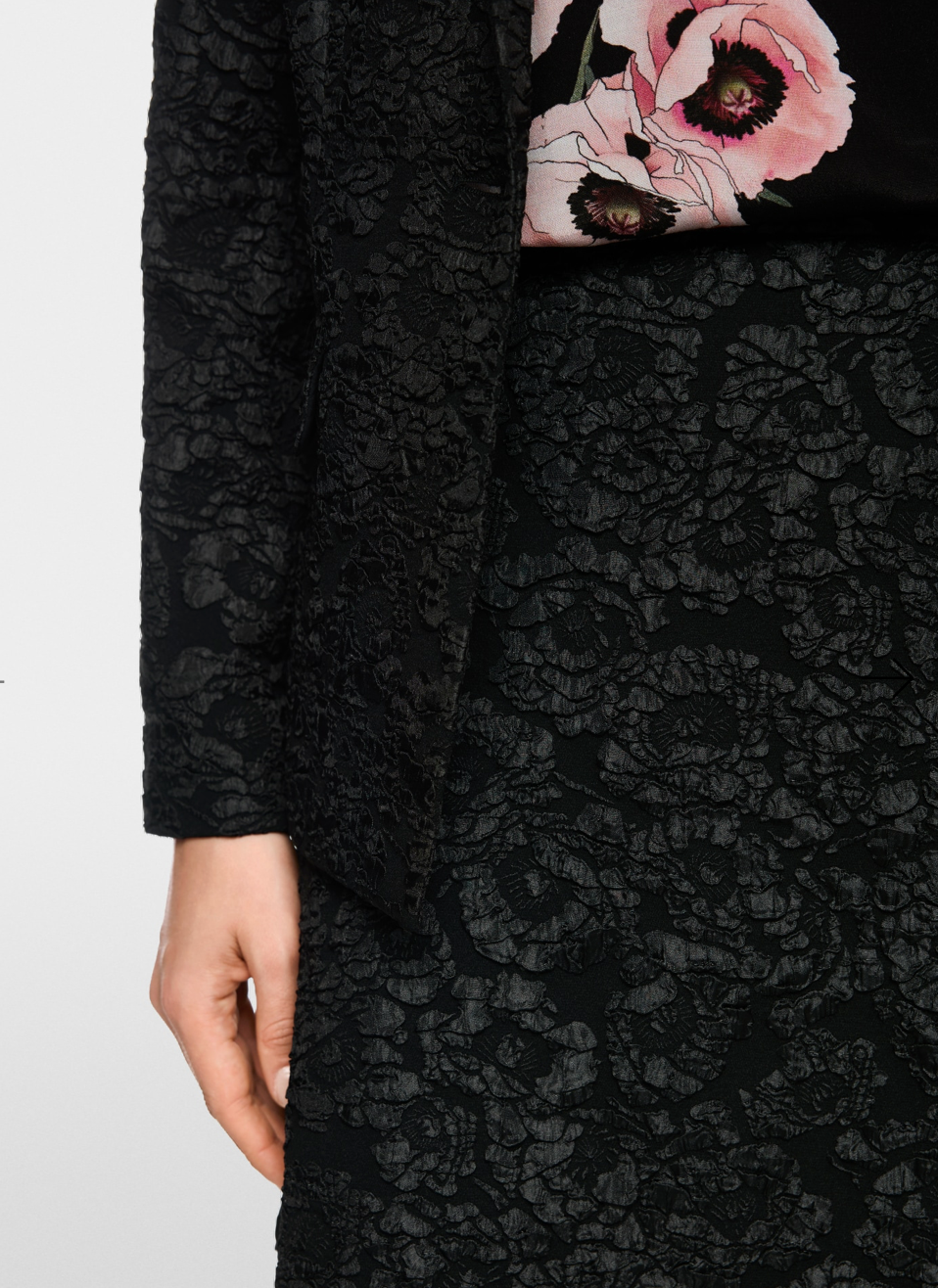 Elegant skirt with a flared shape and a textured floral pattern. This skirt is complemented by practical side pockets, a small waistband and a concealed zip at the back. It is lined and therefore opaque.