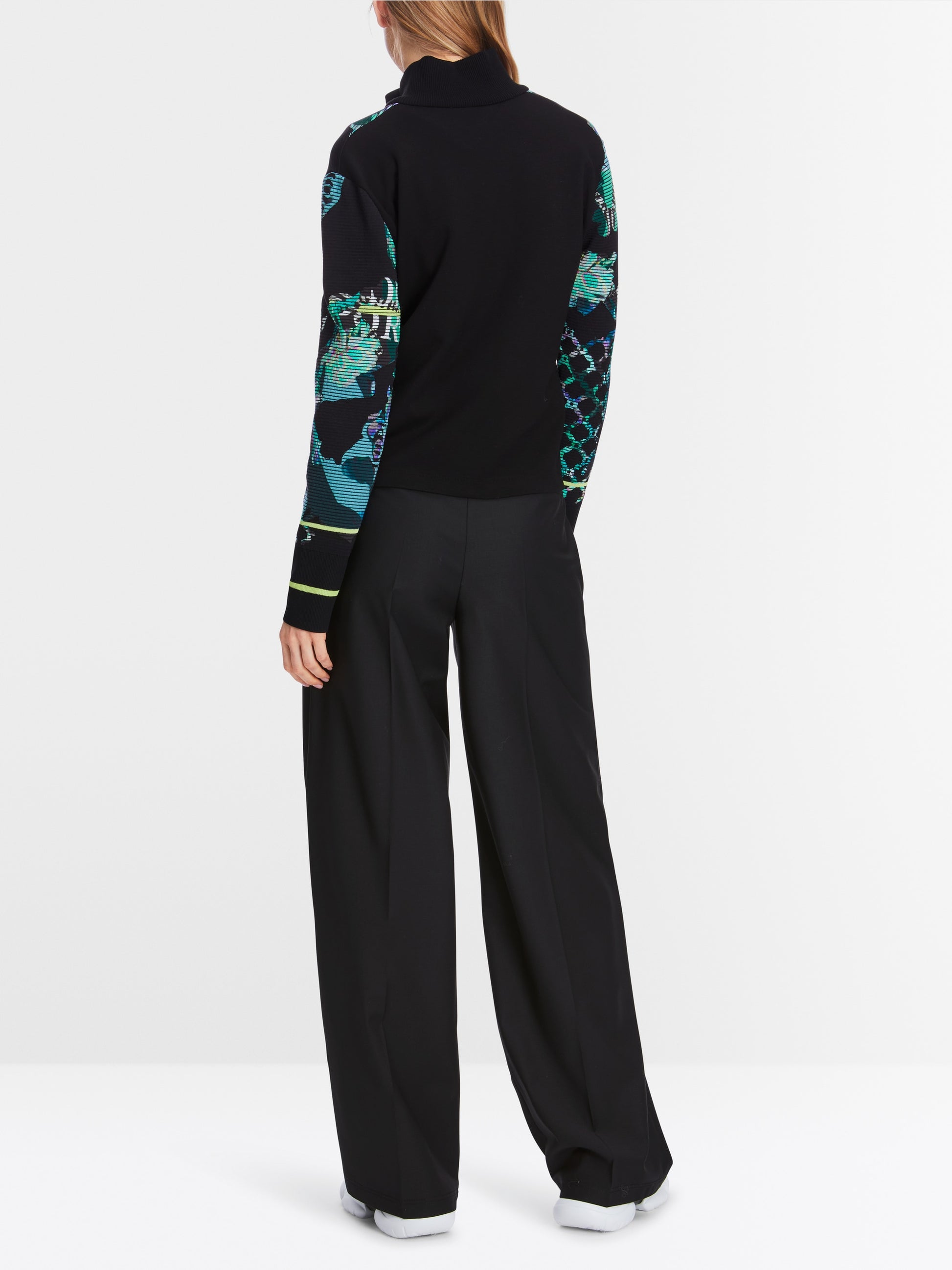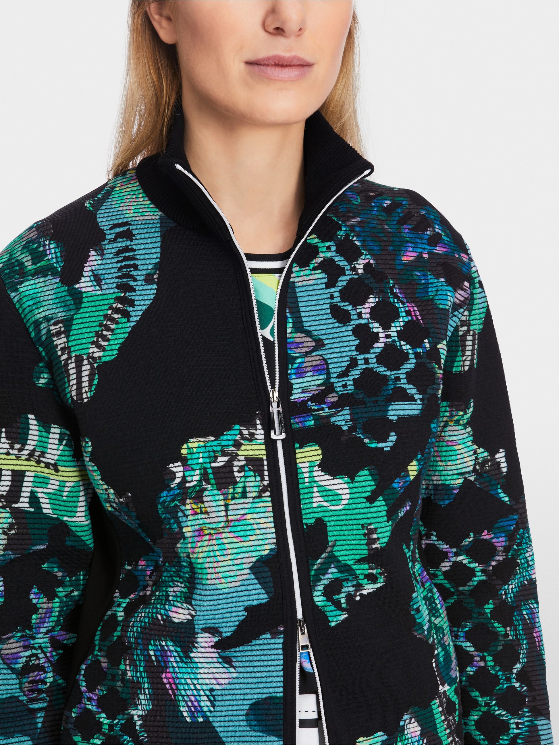 Loose-fit cardigan in a mix of materials and patterns: the front design is a fusion of texture and jacquard. The rib-like texture gives the jacquard design a technical effect. The back and side sections are made of plain jersey. The cardigan is knitted and finished using the latest technology in Germany. The individual parts - such as the back and front etc. - are sewn together in European partner companies.