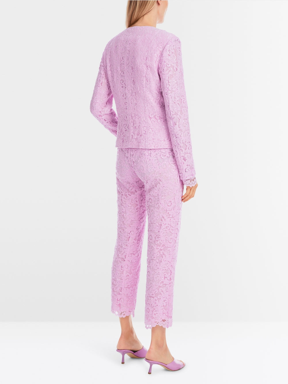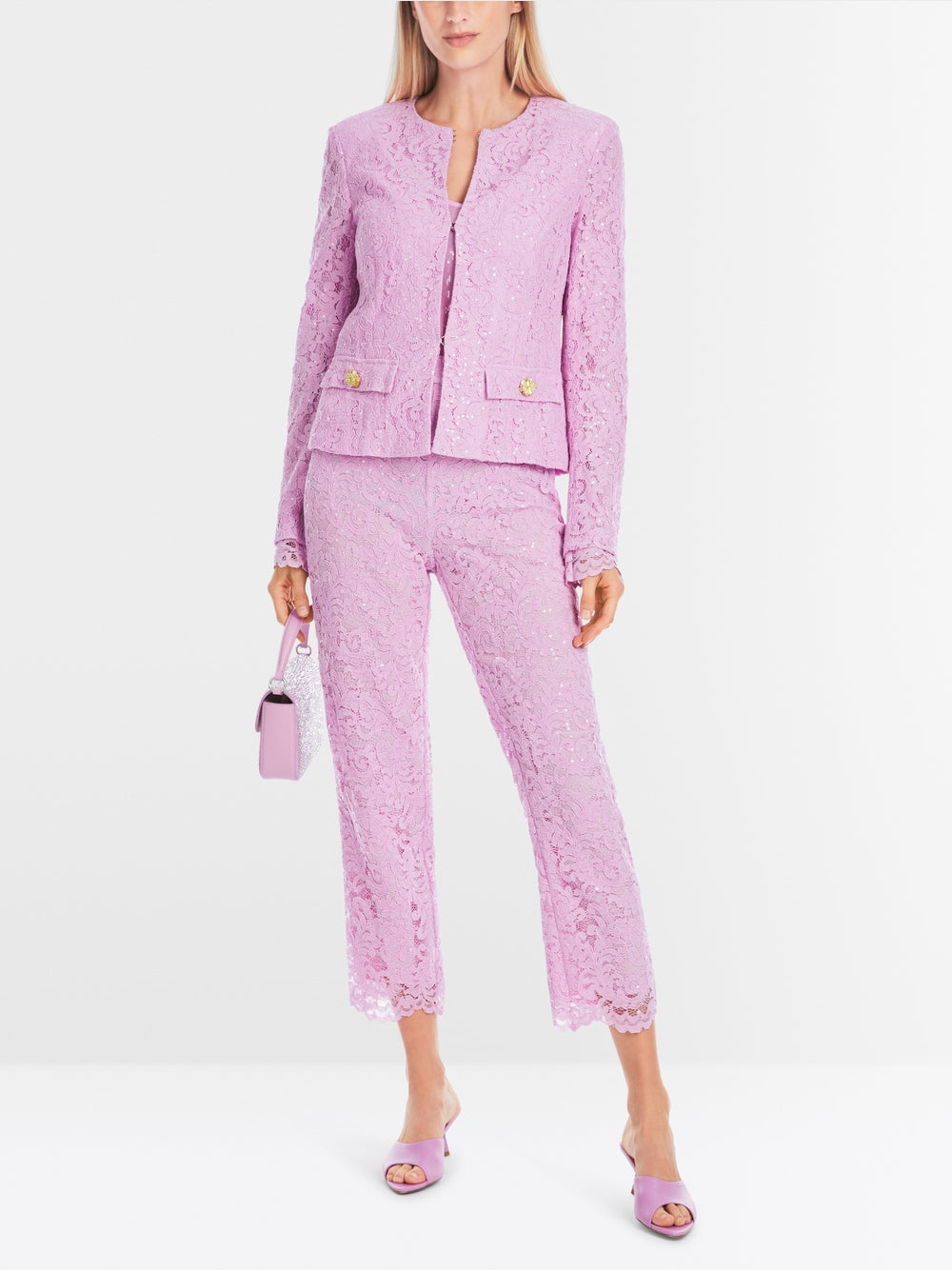 Bolero made from lace fabric. The shape is close to the body and features princess seams and darts. The design is minimalist: this garment has a round neck and can be fastened with a hook and loop. The flap pockets are indicated and have decorative buttons.
