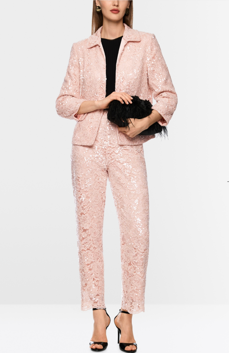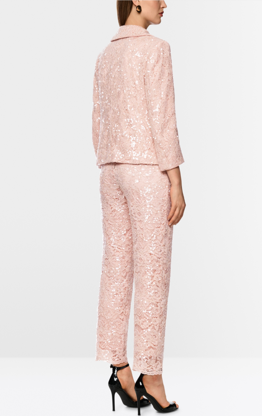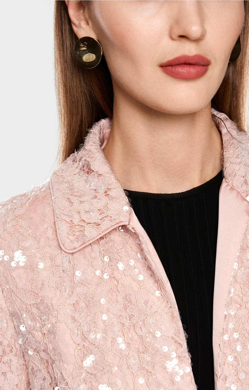 This jacket comes with an elegant lace trim and sequins, making it a shimmering highlight for special occasions. The jacket is slightly cropped and tailored. It features a small collar and has pockets on the front. The jacket is lined and fastens with two hooks.