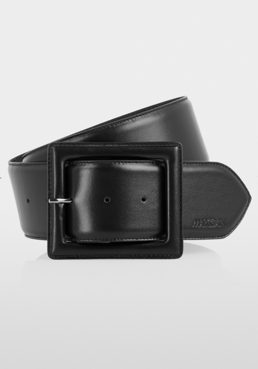 Statement belt made of high-quality leather with a wide fit for the waist. The striking square metal buckle and the embossed Marc Cain logo combine to create a modern, elegant look. Perfect for accentuating dresses, blazers or coats.
