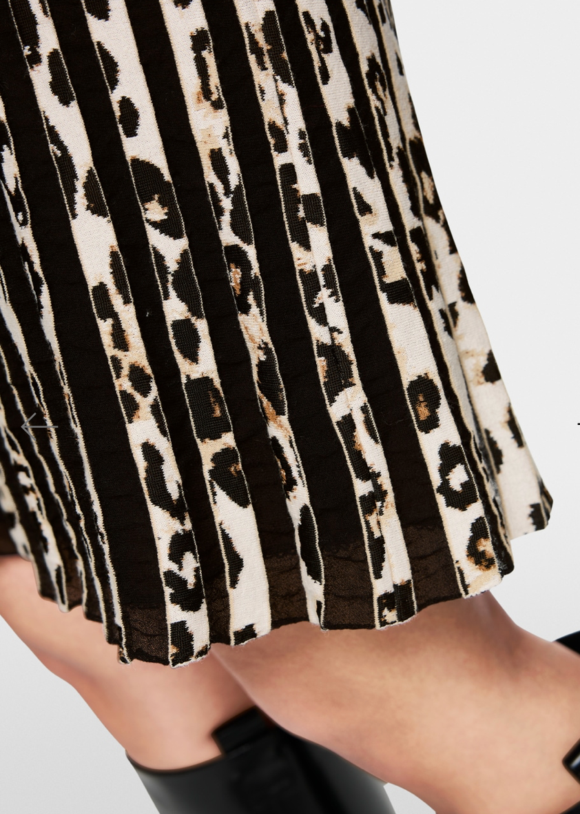 This mini skirt in a trendy leopard print with semi-transparent stripes is an absolute must-have! Its elasticated waistband ensures a perfect fit, while the integrated underskirt guarantees additional comfort. The loose fit creates a casual, modern look. This skirt is knitted and finished in Germany. The individual pieces are further processed at European partner companies. It is therefore Knitted in Germany.