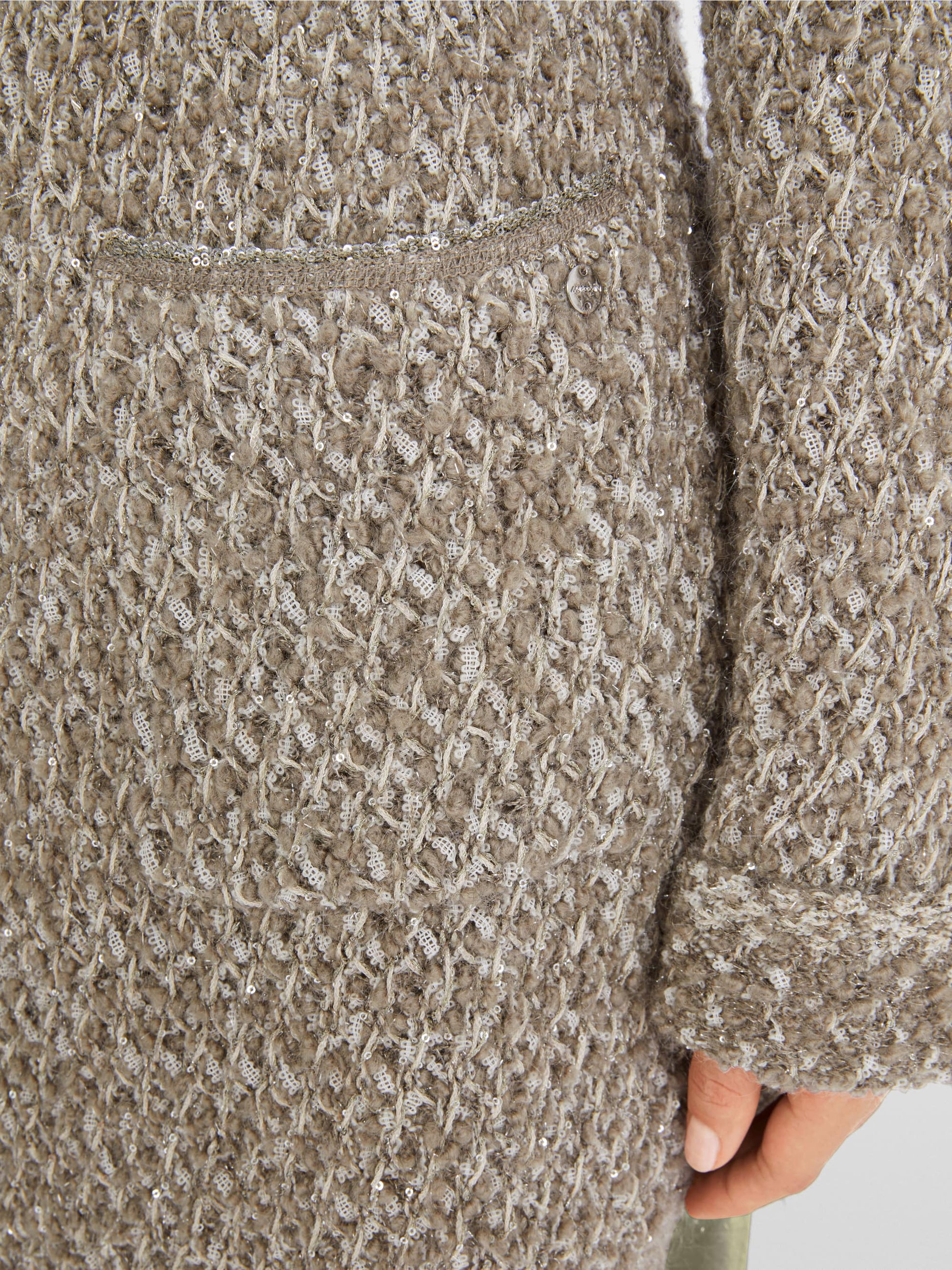 This long cardigan impresses with a subtle shimmer thanks to small sequins and lurex threads. It features a loose silhouette with a round neck. Buttons serve as its closure. Wool, mohair, and alpaca provide a cozy feel. The cardigan is loosely knitted and finished in Germany with bouclé yarn. The further processing of the individual parts takes place in European partner companies. This garment is therefore “Knitted in Germany.”