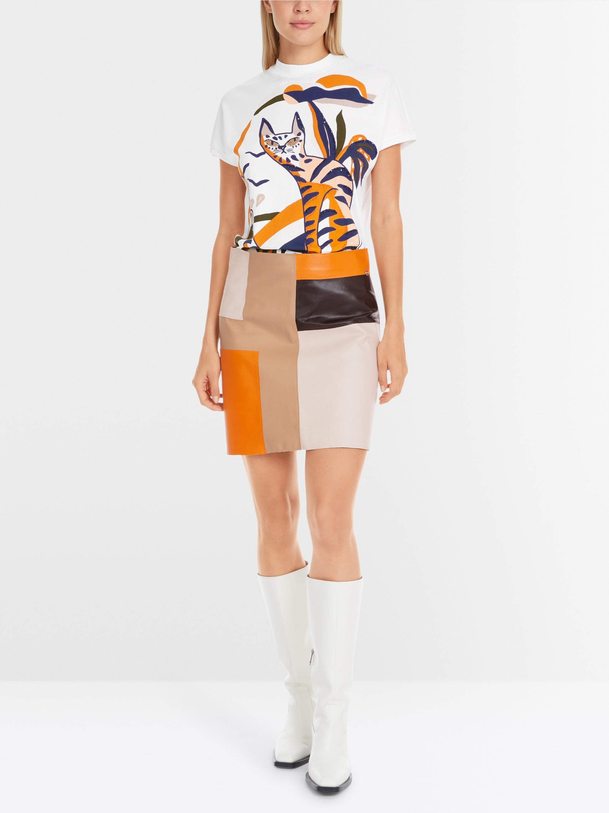 Elegantly presented, this mini skirt is made of fine, soft lamb nappa leather. Its trendy patchwork design catches the eye. The skirt has a slim fit and is fastened with a zip at the back.