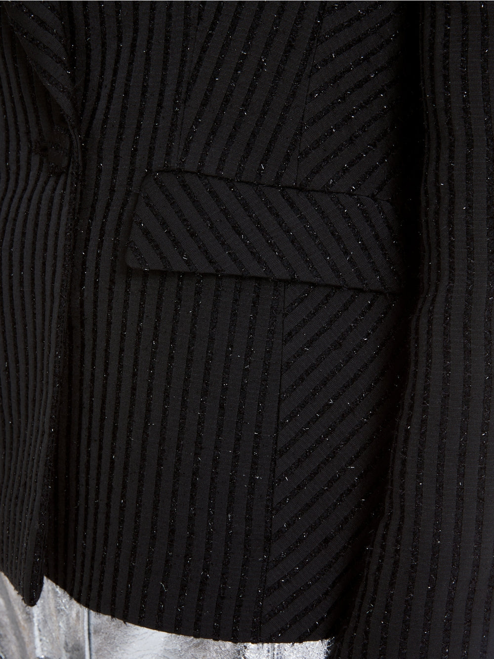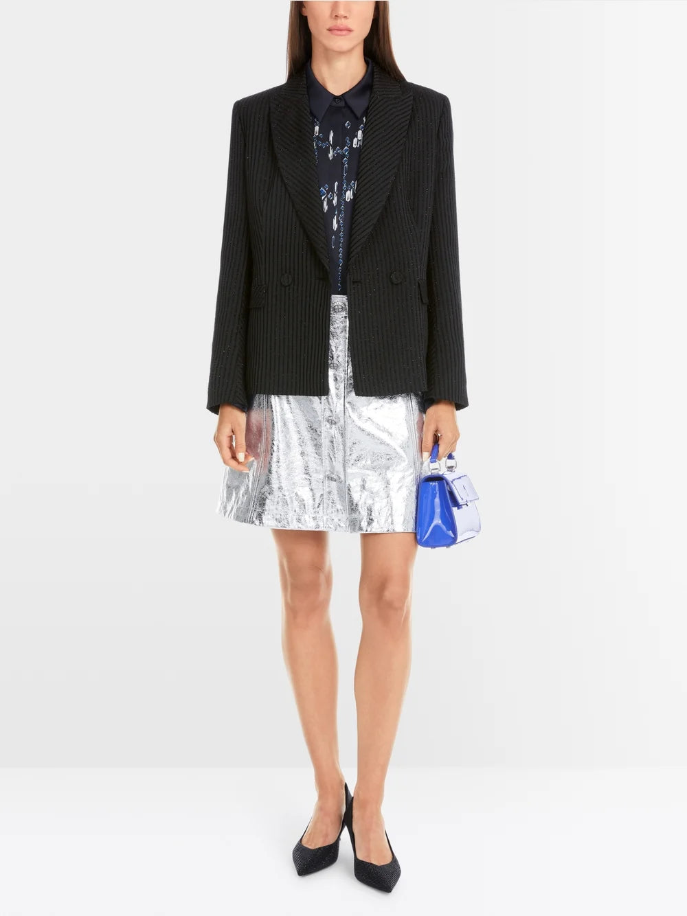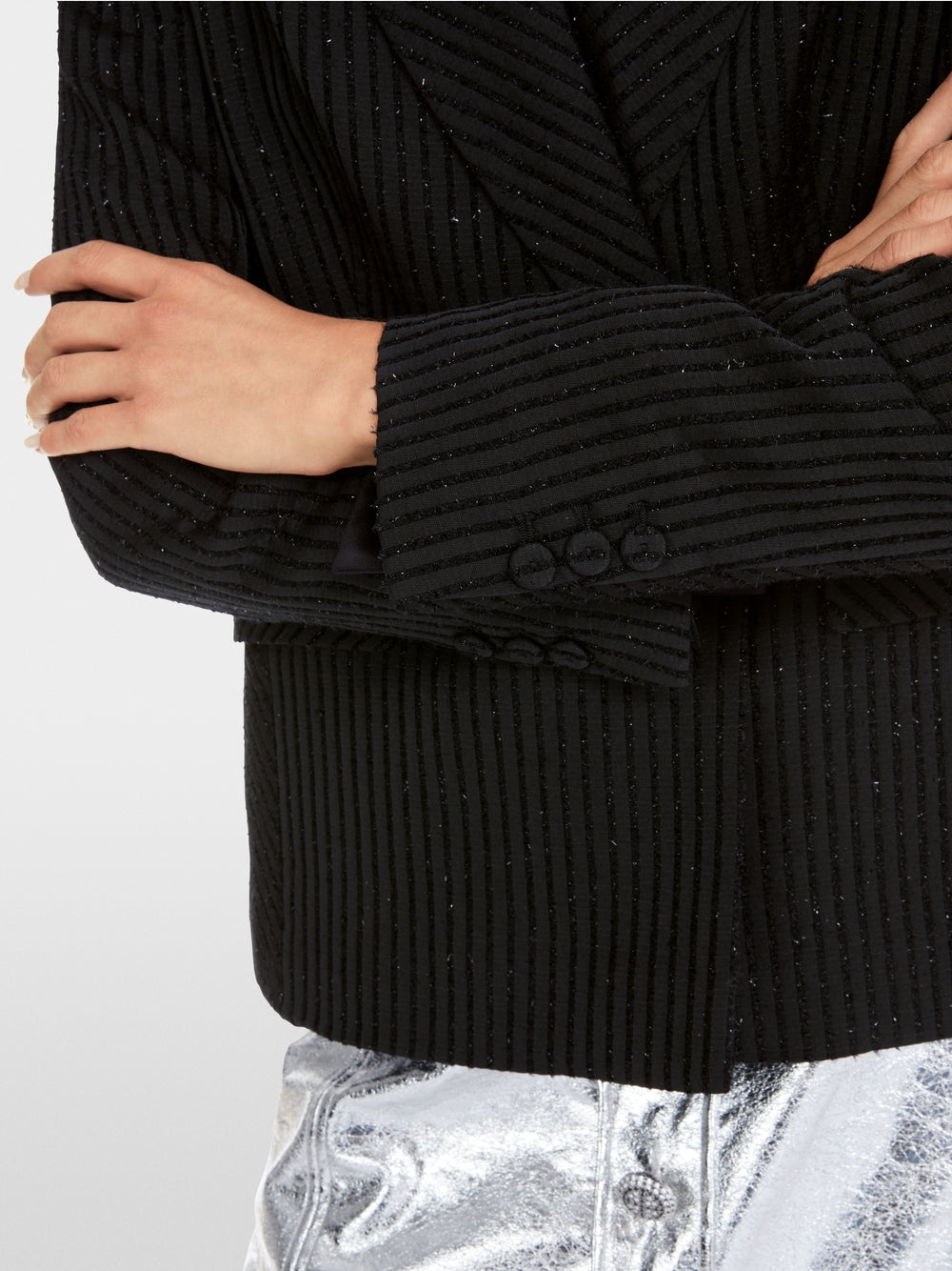 This blazer exudes a touch of glamour with its lurex details. The tonal stripes run diagonally and lengthwise. The covered buttons are a nice extra. The rising lapels, flap pockets and double-breasted design emphasise the classic look. With its slit at the back, this figure-hugging jacket is very comfortable to wear.