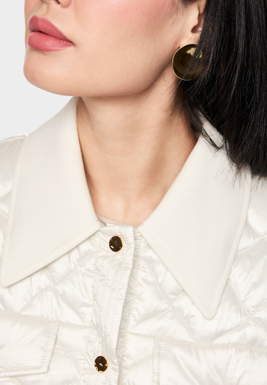 Elegant between-seasons jacket with light padding and a classic collar. The front fastens with gold press studs, and two wing pockets at chest height offer practical details and can also be closed with press studs. This jacket is from the ‘Rethink Together’ sustainability label.
