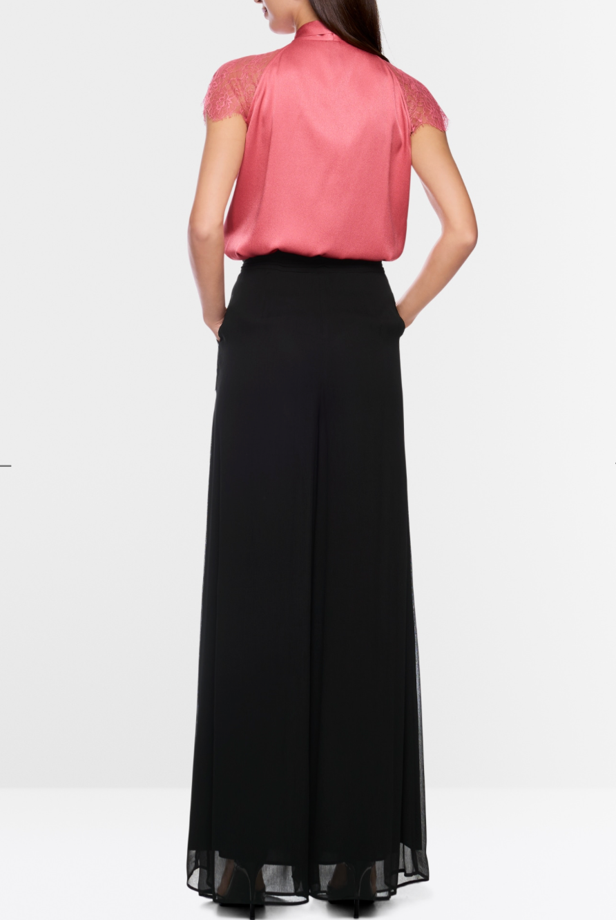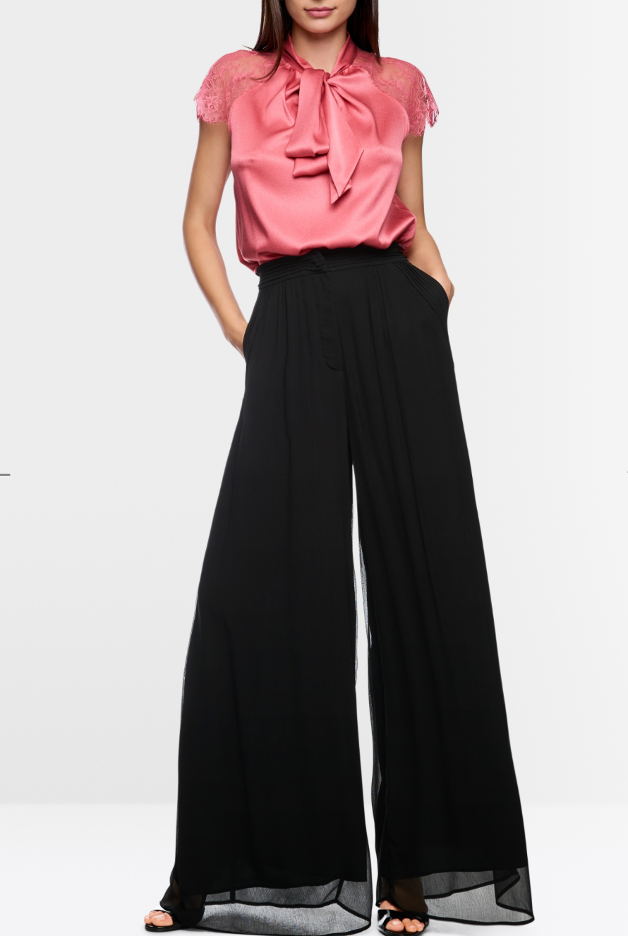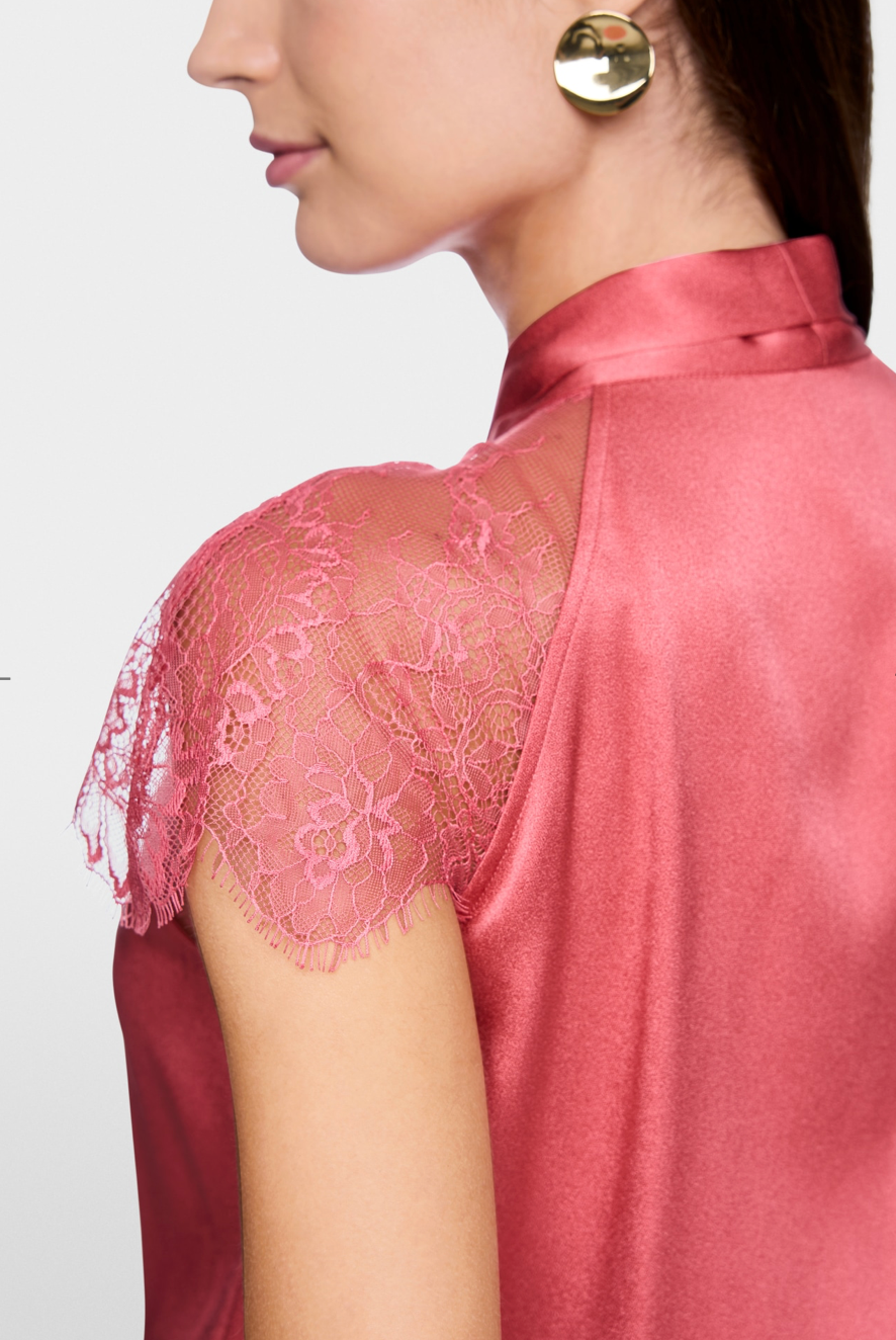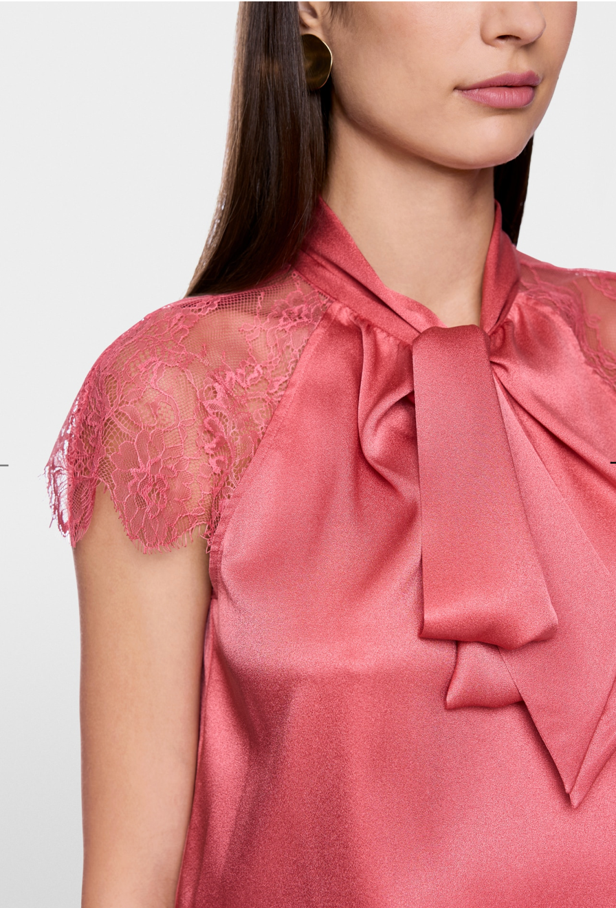 A classic top meets the elegance of a bow-tie blouse. The cut is straight and the shoulders are accentuated by an elegant lace insert. The airy silk blend with elastane makes this blouse comfortable to wear. A true classic that complements any chic look.