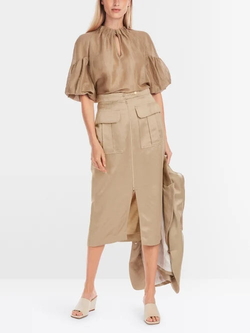 Feminine midi skirt in a utility style. Classic: the large patch pockets on the front. This skirt fastens with a full-length zip. The material is made from a sophisticated blend of fibres and has a shiny surface.