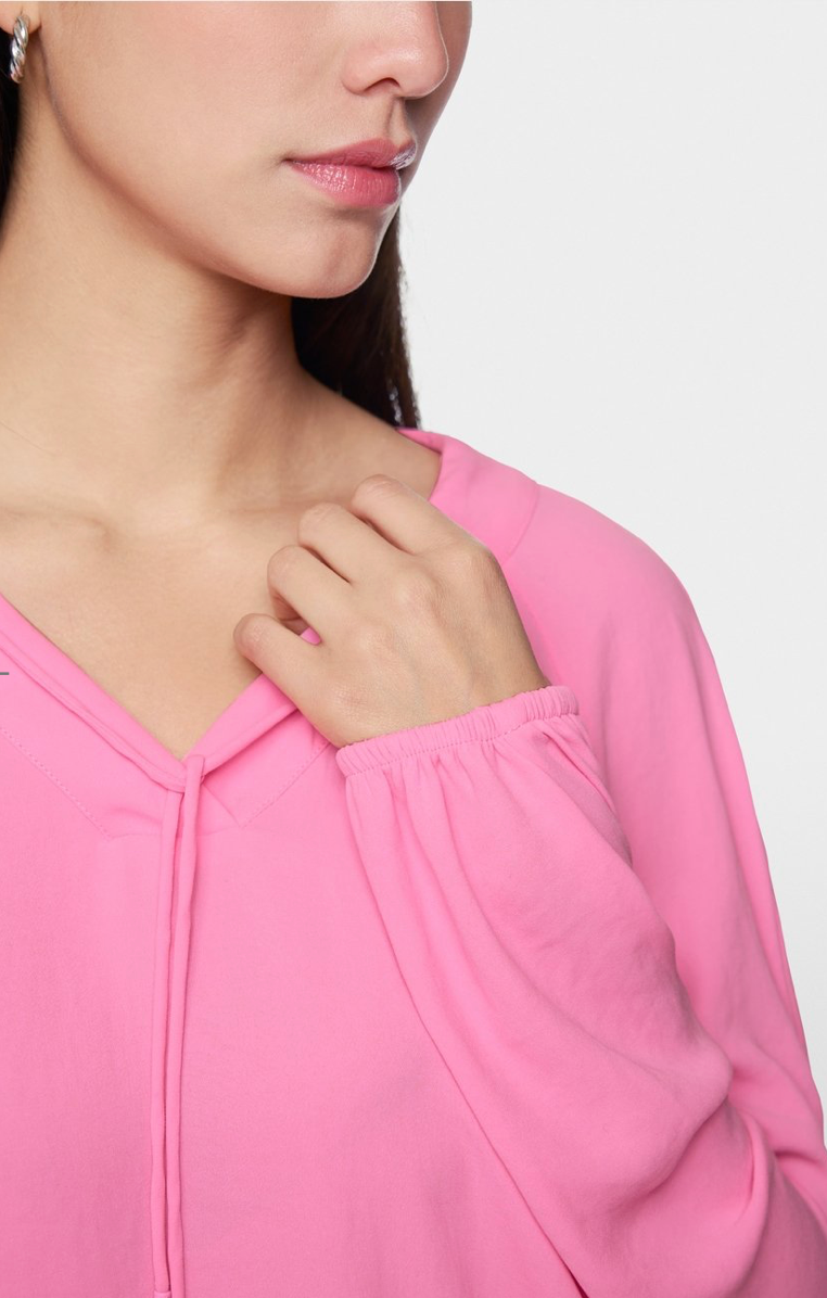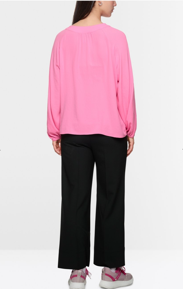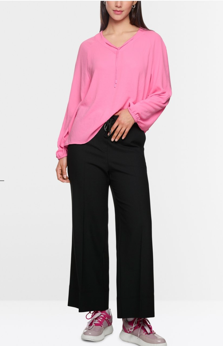 A sporty, casual cut characterizes the style of this blouse. It also has a loose silhouette. The long sleeves are raglan-style with elasticated cuffs. The neckline has a shallow V-neck and drawstring.