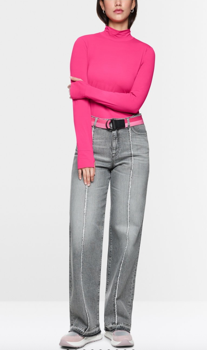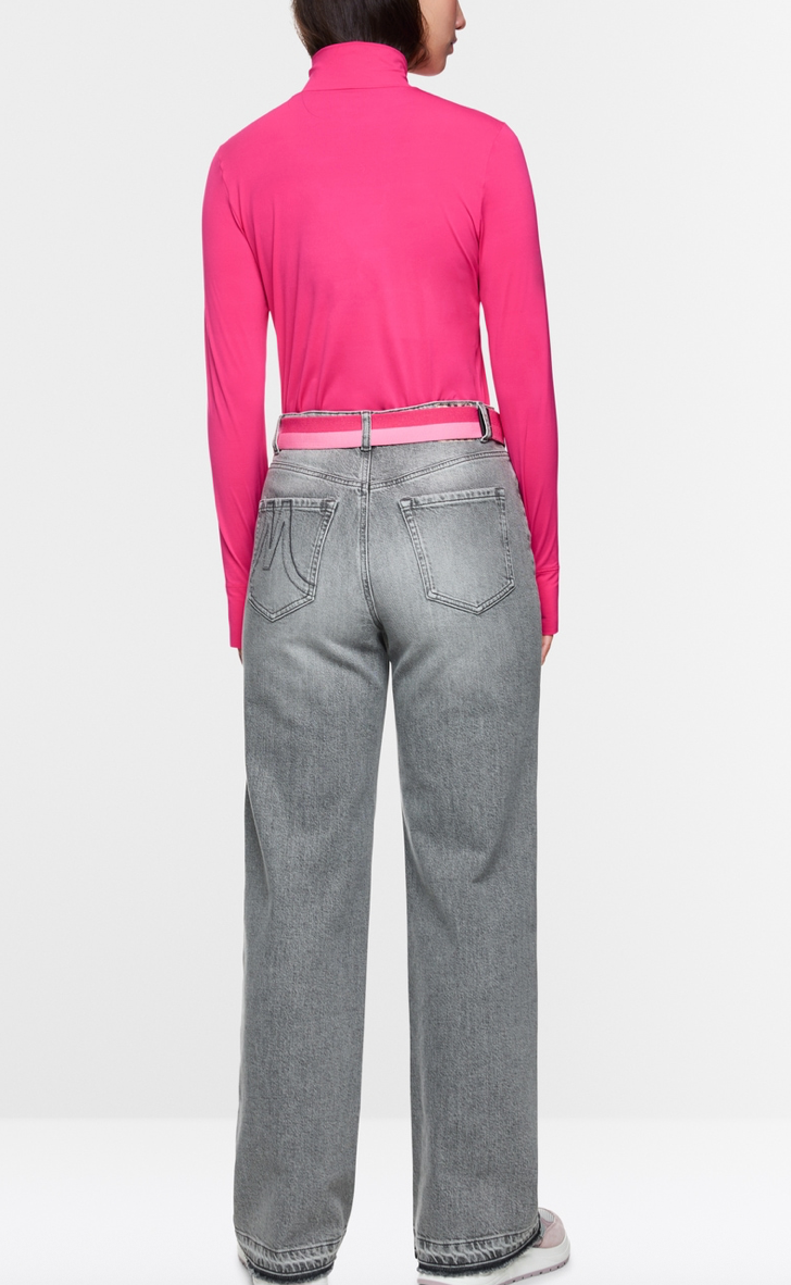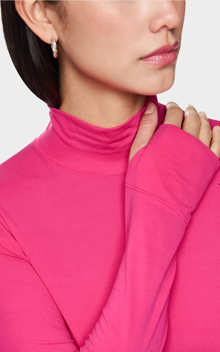 Long-sleeved shirt in stretch jersey. This garment is close-fitting and high-necked. With their longer length, the sleeves are inspired by sportswear. A versatile basic.