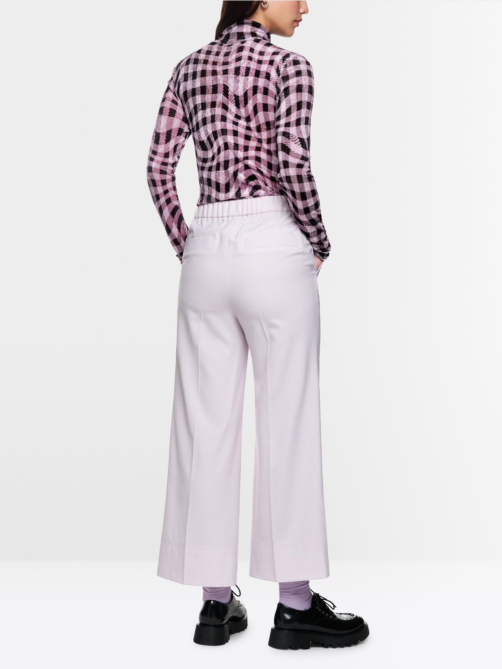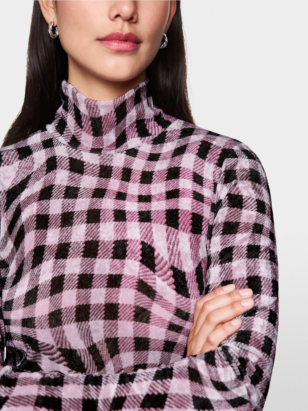 This long-sleeved shirt impresses with its elegant stand-up collar and mesh look. The surface of the slightly transparent material is velvety soft and the fit is figure-hugging. The special check pattern makes the shirt a real eye-catcher. It combines especially well with a blazer.