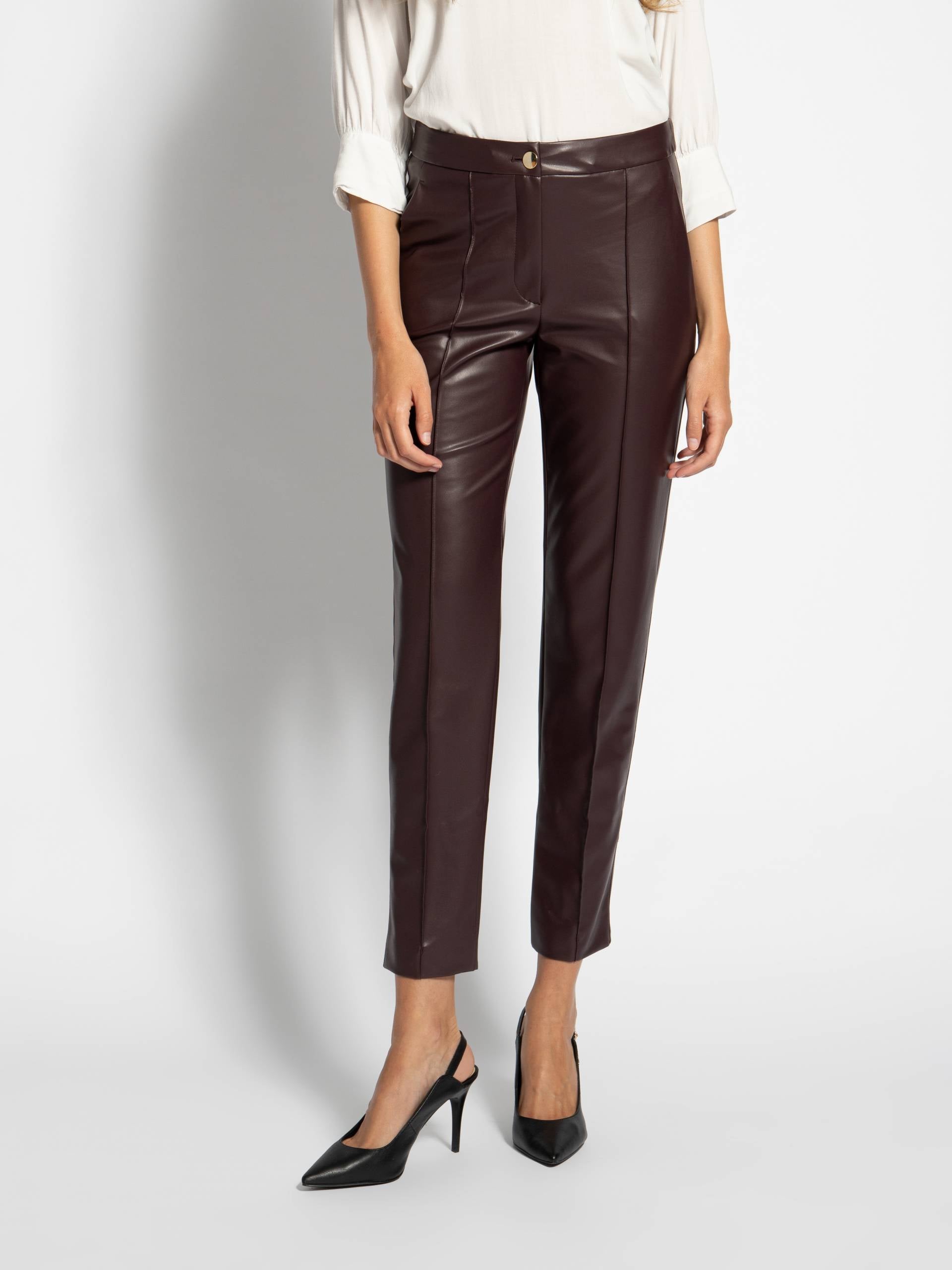 These faux leather pants are in a gorgeous purple toned maroon color and feature a mid waist and slim leg with gold button detail.