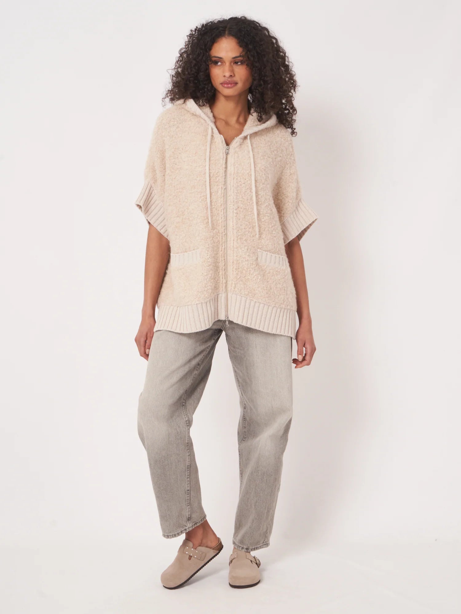 Crafted from a luxurious alpaca blend, this zip-front hoodie sweater features a relaxed silhouette with soft boucle texture. Wide ribbed trims, patch pockets, and short sleeves enhance its cozy appeal, while the drawstring hood adds a casual finish. Effortlessly modern layering.