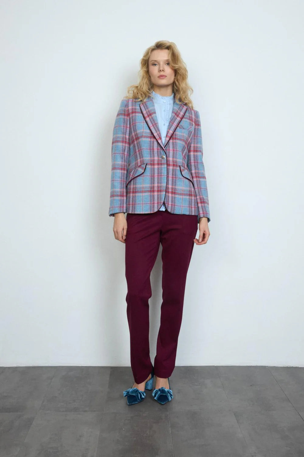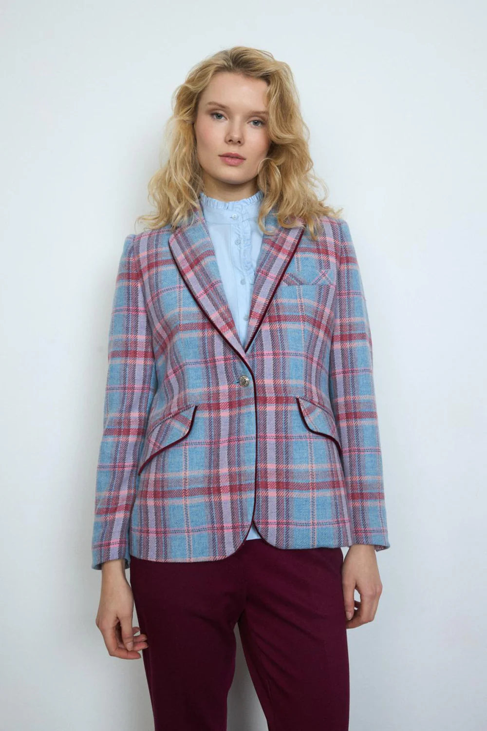 Slim-fit blazer. Checked tweed fabric. Notched lapel collar with contrast piping. Metal button front closure. Faux flap pockets. Long sleeves with a mock button closure and a slight slit. Slightly rounded hem with no vents.