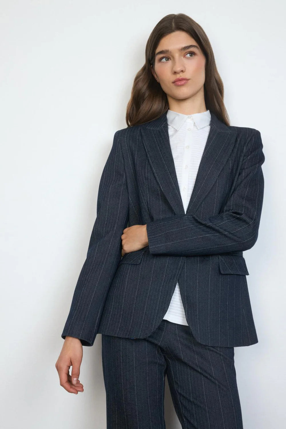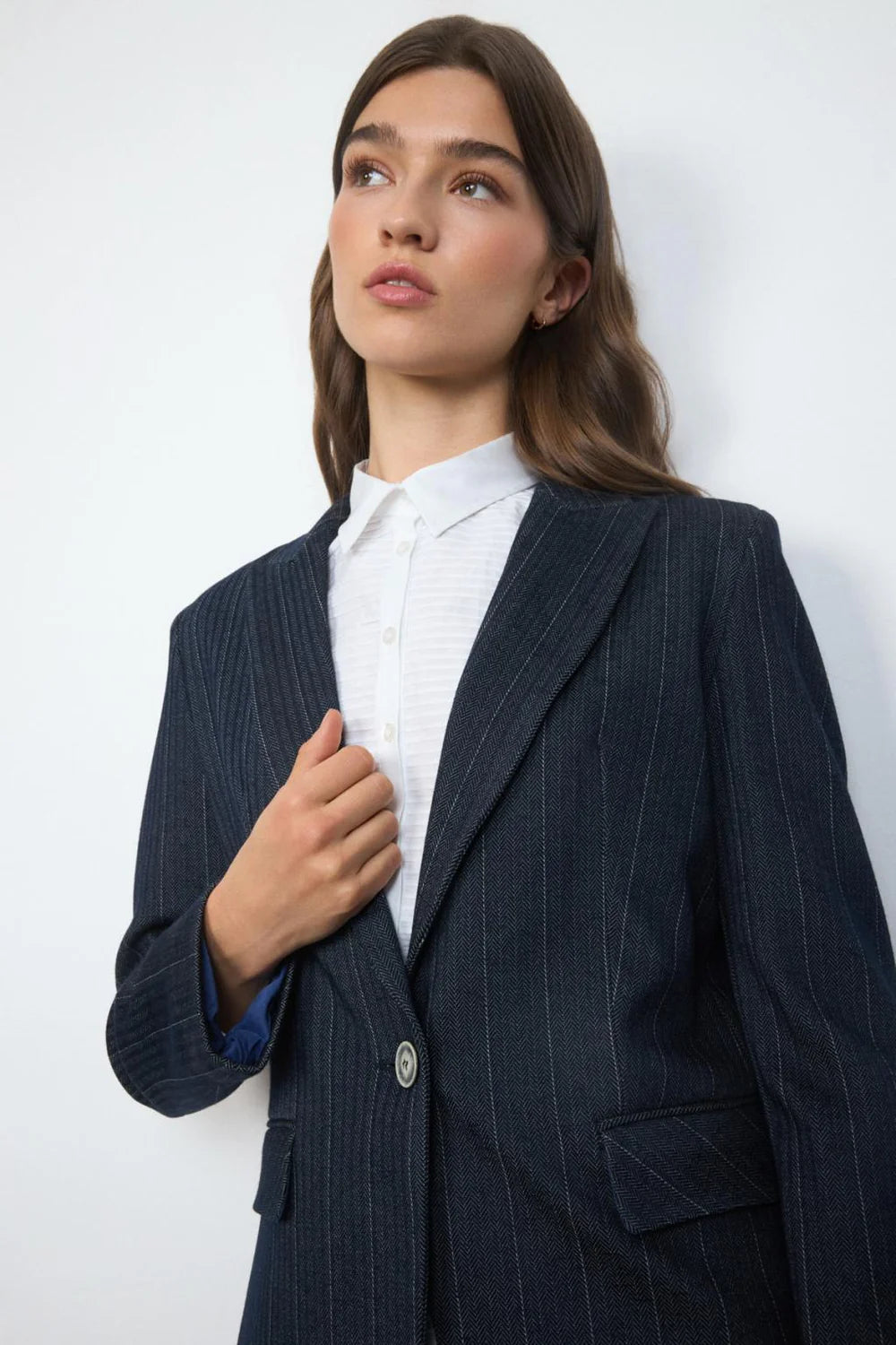 Slim-fit pinstripe blazer. Notched lapel collar. Contrast button front closure. Long, straight sleeves. Rounded hem with no vents. Faux flap pockets. Designed and made in Spain.