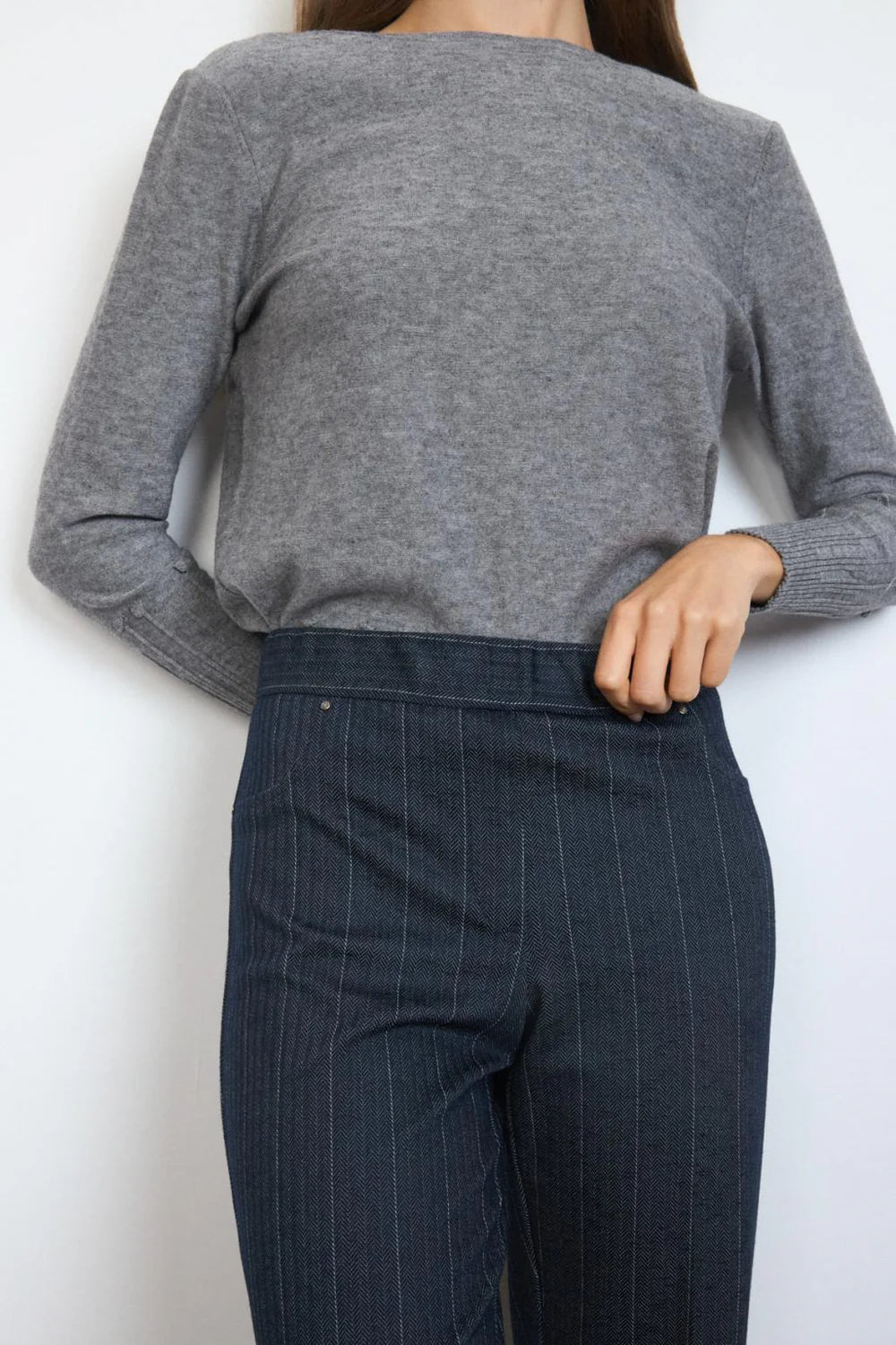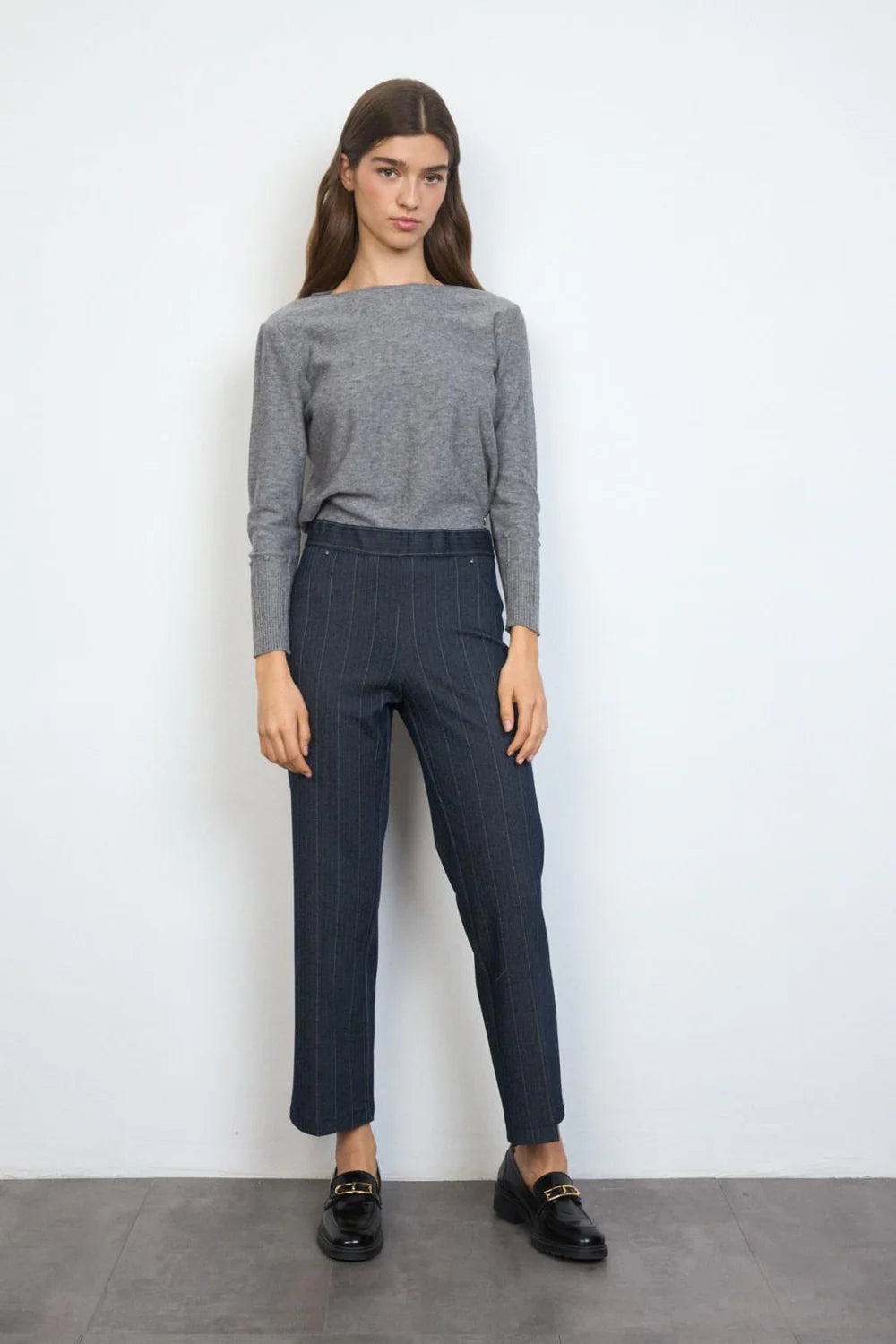 Straight-leg pinstripe trousers. High waist. Belt loops. Studded side pockets. Designed and manufactured in Spain.