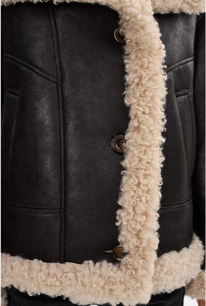 Soft and statement-making, the DEMI Faux Shearling Coat is crafted from soft faux suede leather with rich curly faux shearling trim. Designed with an oversized shawl collar, tonal button closure, and a straight, hip-length silhouette, it balances cozy volume with clean tailoring for an effortlessly elevated finish.