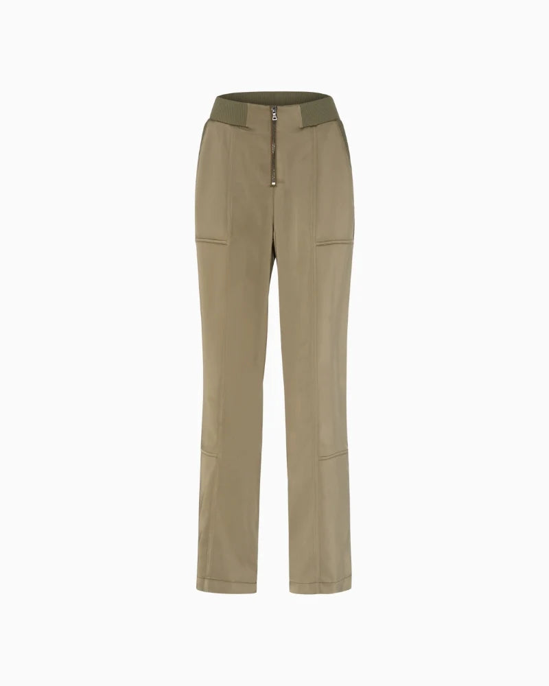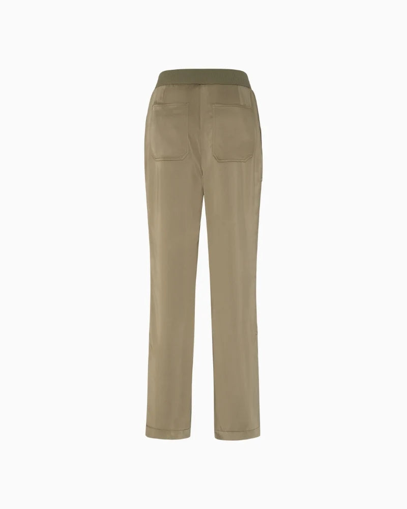 These satin trousers combine the elegant sheen of soft satin with sporty knitted rib details. Attached pockets and workwear elements add casual accents and make them a versatile fashion piece