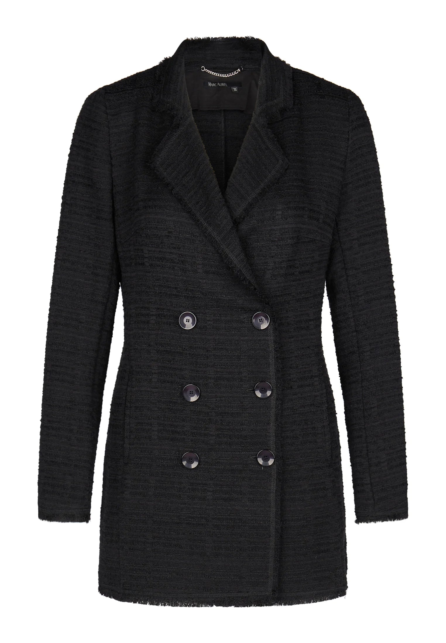This long blazer in a fringed look is made from a textured, soft viscose and cotton blend with stretch. The double-breasted design features fringed accents on the jacket and sleeve hems as well as on the notch lapels.