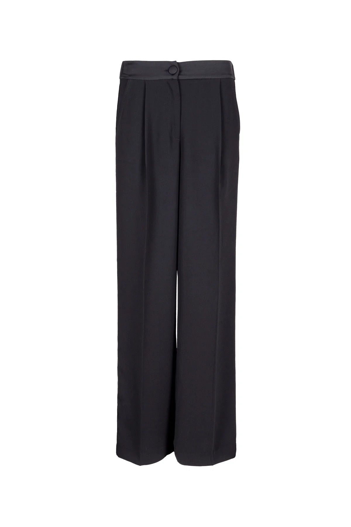 Peruzzi embellished trim trouser features diamante sports stripe with a satin button closure. Designed with a broad satin waistband for enhanced comfort, this tailored front-pleated trousers also include convenient side pockets.
