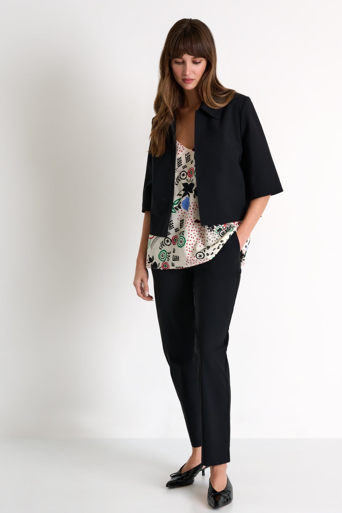 Straight-leg lycra pants, featuring elegant darts at the back that shape the silhouette. It has defined pockets, is stretchy, and offers a lightweight feel, combining practicality and comfort.